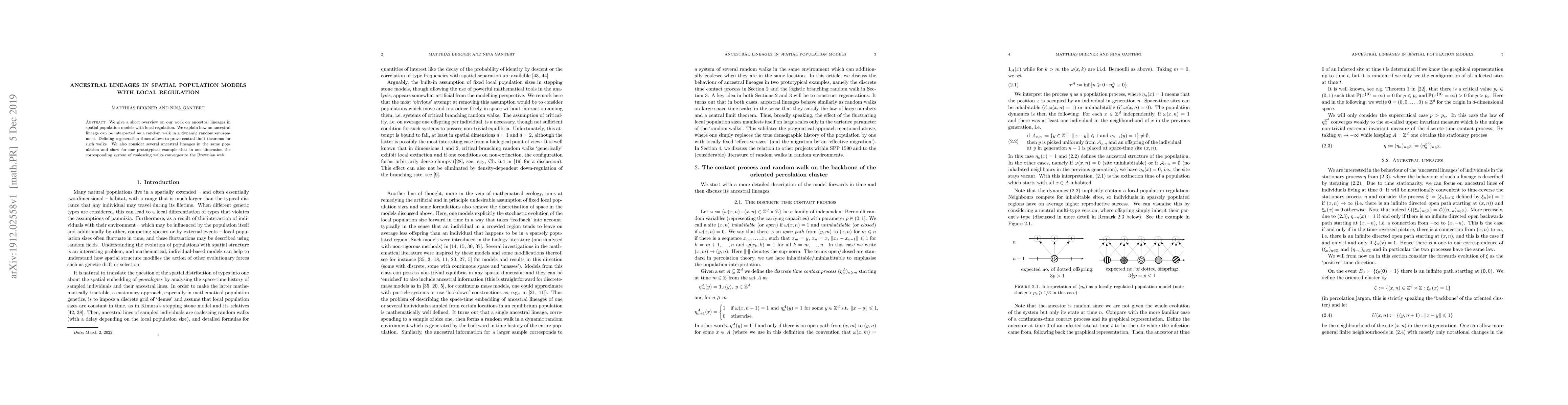 We give a short overview on our work on ancestral lineages in spatial population models with local regulation. We explain how an ancestral lineage can be interpreted as a random walk in a dynamic random environment. Defining regeneration times allows to prove central limit theorems for such walks. We also consider several ancestral lineages in the same population and show for one prototypical example that in one dimension the corresponding system of coalescing walks converges to the Brownian web.
