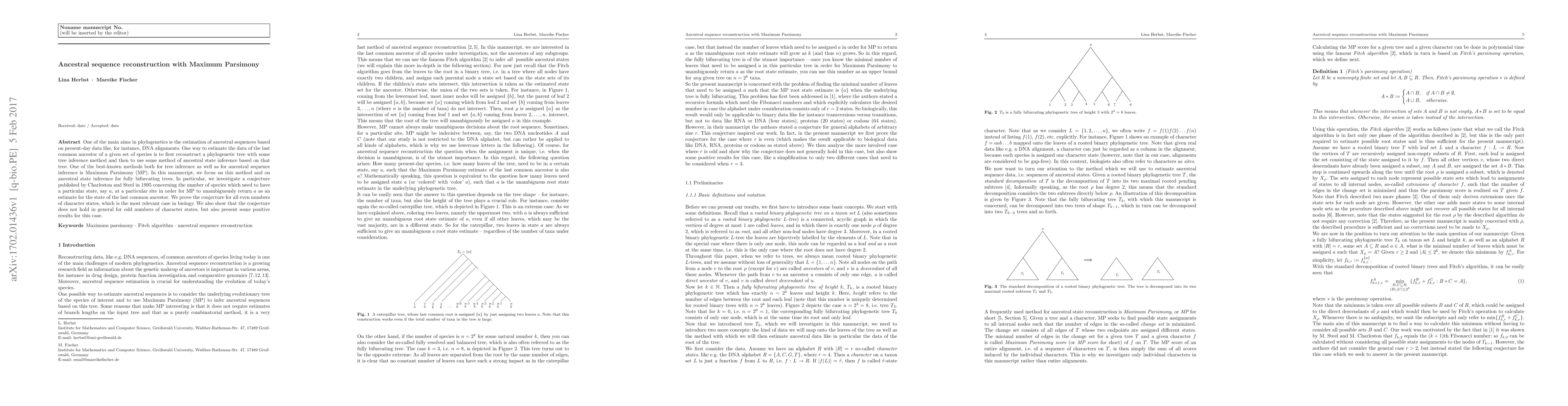 This paper investigates the Maximum Parsimony method for reconstructing ancestral sequences in phylogenetics, focusing on fully bifurcating trees. It proves a conjecture by Charleston and Steel regarding the minimum number of species needed for MP to unambiguously estimate the ancestral state for even numbers of character states, while showing that the conjecture does not generally hold for odd numbers.