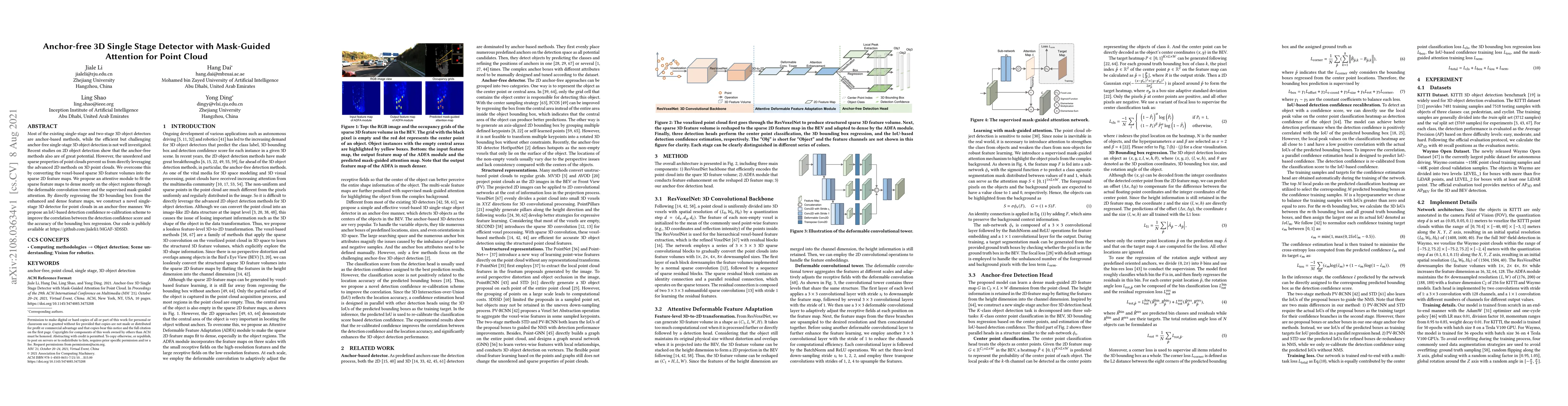 This paper introduces an anchor-free single-stage 3D object detector for point clouds, converting sparse 3D feature volumes into dense 2D feature maps using deformable convolutions and mask-guided attention. The method enhances feature maps focusing on object regions, directly regressing 3D bounding boxes and recalibrating detection confidence for improved accuracy.