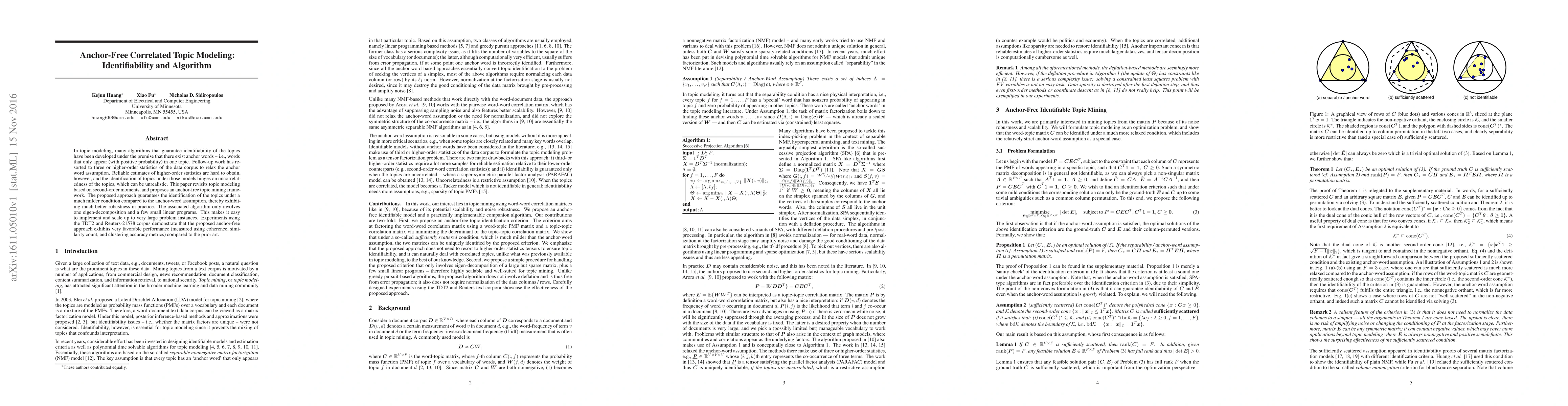 A new topic modeling framework is proposed that guarantees identifiability of topics without relying on anchor words, resulting in better robustness and performance compared to existing approaches.