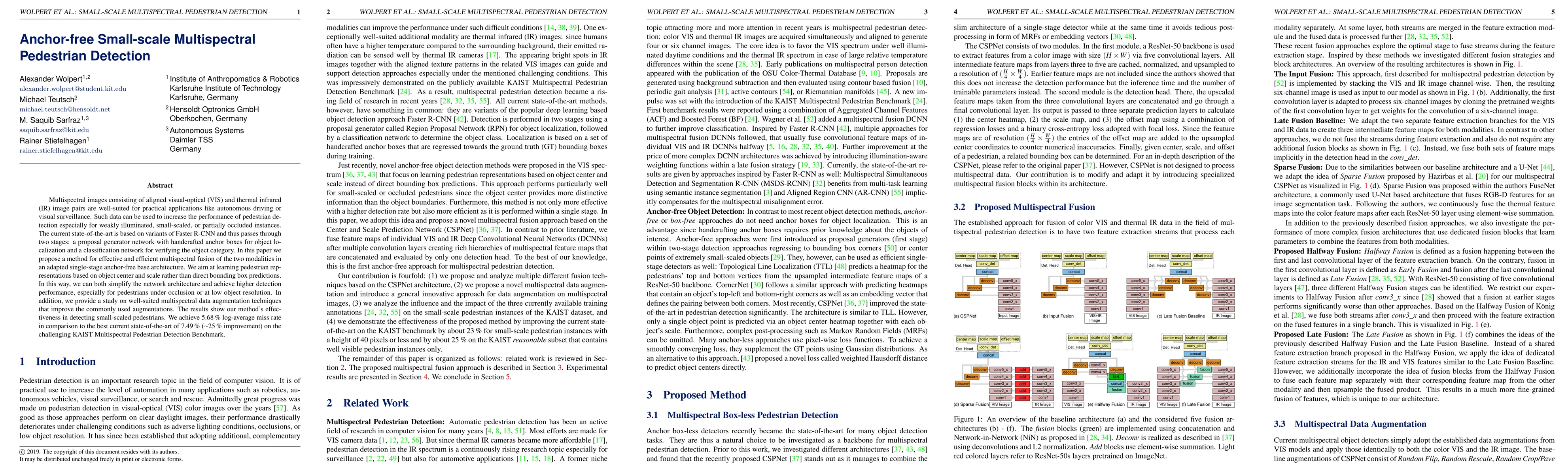Multispectral images consisting of aligned visual-optical (VIS) and thermal infrared (IR) image pairs are well-suited for practical applications like autonomous driving or visual surveillance. Such data can be used to increase the performance of pedestrian detection especially for weakly illuminated, small-scaled, or partially occluded instances. The current state-of-the-art is based on variants of Faster R-CNN and thus passes through two stages: a proposal generator network with handcrafted anchor boxes for object localization and a classification network for verifying the object category. In this paper we propose a method for effective and efficient multispectral fusion of the two modalities in an adapted single-stage anchor-free base architecture. We aim at learning pedestrian representations based on object center and scale rather than direct bounding box predictions. In this way, we can both simplify the network architecture and achieve higher detection performance, especially for pedestrians under occlusion or at low object resolution. In addition, we provide a study on well-suited multispectral data augmentation techniques that improve the commonly used augmentations. The results show our method's effectiveness in detecting small-scaled pedestrians. We achieve 5.68% log-average miss rate in comparison to the best current state-of-the-art of 7.49% (25% improvement) on the challenging KAIST Multispectral Pedestrian Detection Benchmark. Code: https://github.com/HensoldtOptronicsCV/MultispectralPedestrianDetection