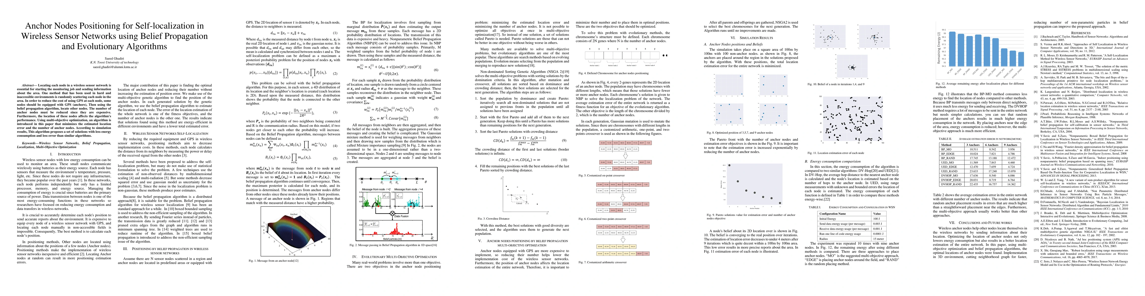 This paper proposes an algorithm combining belief propagation and evolutionary algorithms to optimize the positioning of anchor nodes in wireless sensor networks, aiming to minimize location error and reduce the number of expensive GPS-equipped anchors. Simulation results show the proposed method achieves better performance in terms of energy consumption and accuracy compared to similar approaches.