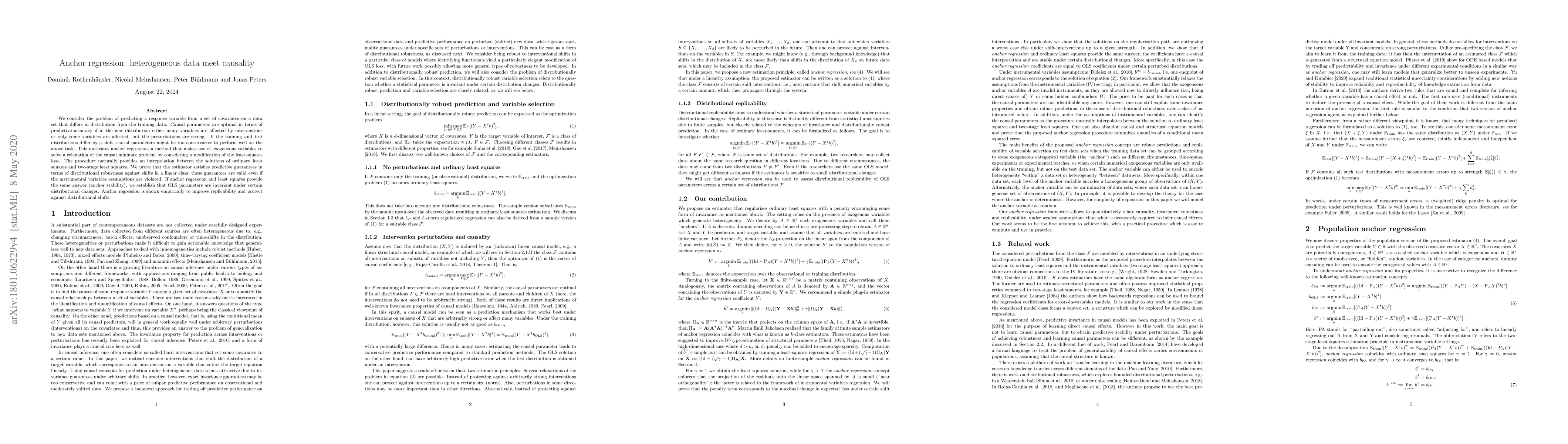 Anchor regression addresses the challenge of predicting response variables from covariate data that differ in distribution from training data. It leverages exogenous variables to enhance predictive accuracy, offering robustness against distributional shifts while maintaining causal insights.