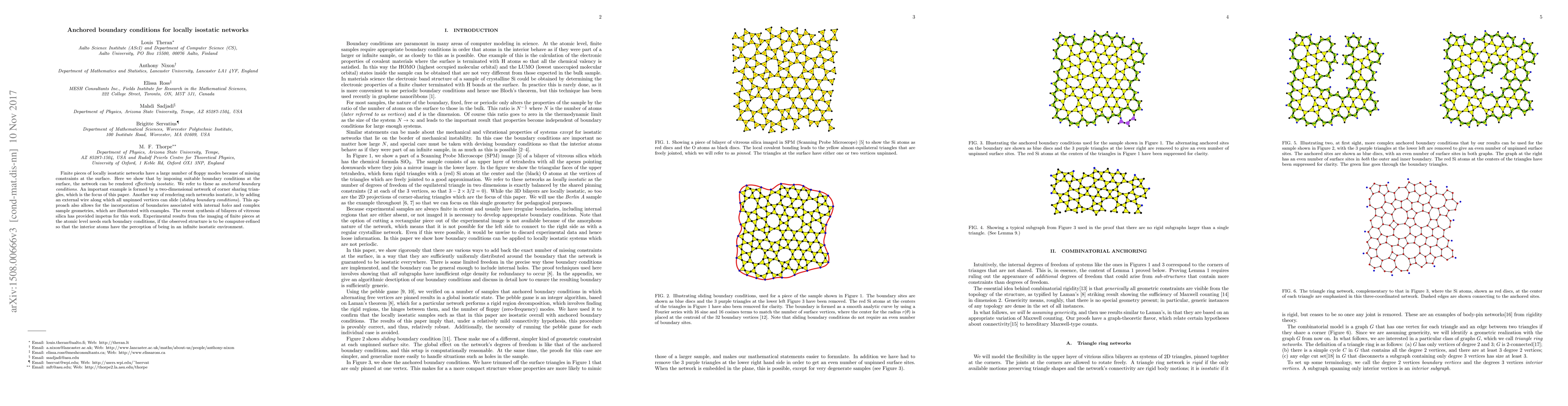 Finite pieces of locally isostatic networks have a large number of floppy modes because of missing constraints at the surface. Here we show that by imposing suitable boundary conditions at the surface, the network can be rendered effectively isostatic. We refer to these as anchored boundary conditions. An important example is formed by a two-dimensional network of corner sharing triangles, which is the focus of this paper. Another way of rendering such networks isostatic, is by adding an external wire along which all unpinned vertices can slide (sliding boundary conditions). This approach also allows for the incorporation of boundaries associated with internal holes and complex sample geometries, which are illustrated with examples. The recent synthesis of bilayers of vitreous silica has provided impetus for this work. Experimental results from the imaging of finite pieces at the atomic level needs such boundary conditions, if the observed structure is to be computer-refined so that the interior atoms have the perception of being in an infinite isostatic environment.