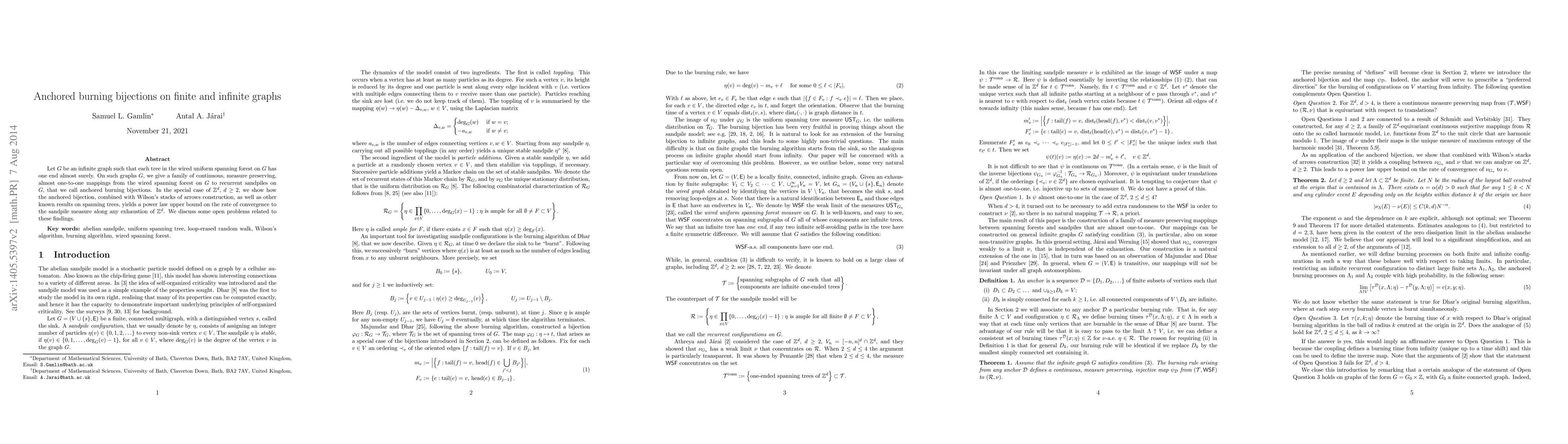 Let $G$ be an infinite graph such that each tree in the wired uniform spanning forest on $G$ has one end almost surely. On such graphs $G$, we give a family of continuous, measure preserving, almost one-to-one mappings from the wired spanning forest on $G$ to recurrent sandpiles on $G$, that we call anchored burning bijections. In the special case of $\mathbb{Z}^d$, $d \ge 2$, we show how the anchored bijection, combined with Wilson's stacks of arrows construction, as well as other known results on spanning trees, yields a power law upper bound on the rate of convergence to the sandpile measure along any exhaustion of $\mathbb{Z}^d$. We discuss some open problems related to these findings.