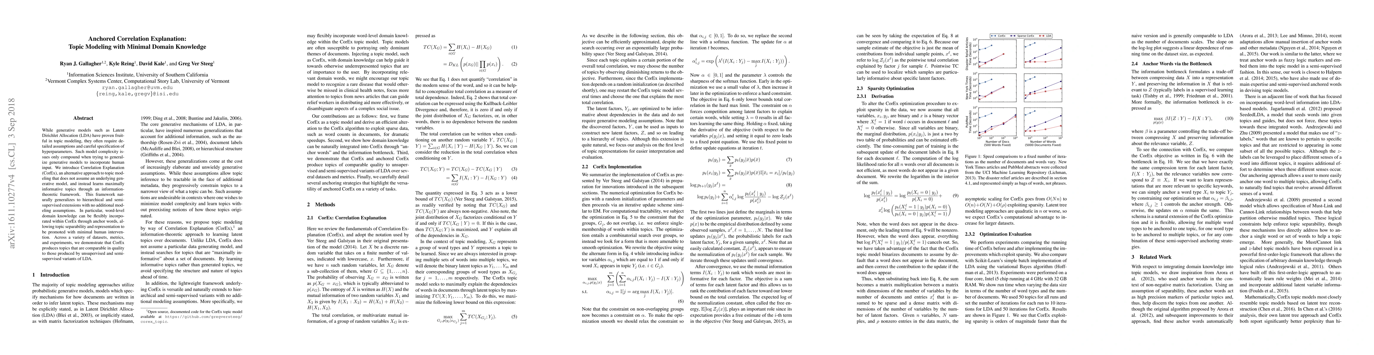 The paper introduces Correlation Explanation (CorEx), a novel topic modeling approach that avoids the complexity of generative models like LDA by learning topics through an information-theoretic framework. CorEx can flexibly incorporate minimal domain knowledge via anchor words, producing comparable topic modeling results with less human intervention.