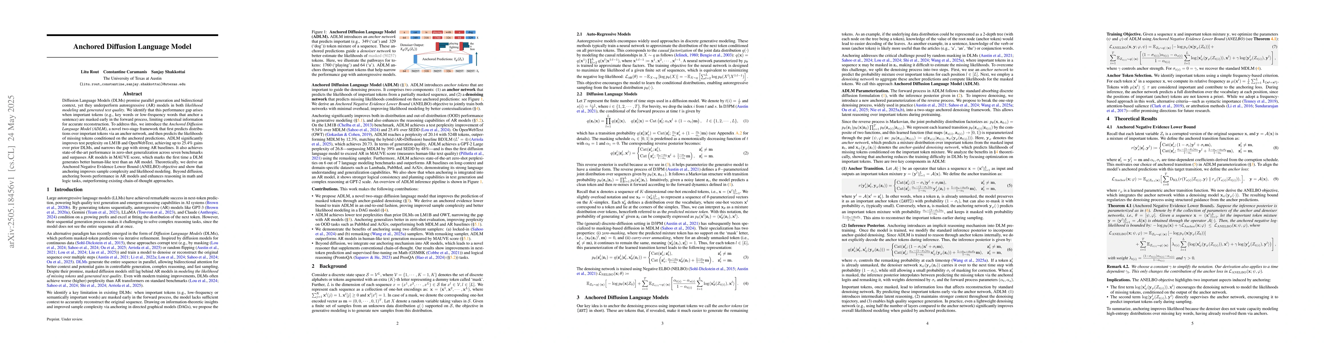 Diffusion Language Models (DLMs) promise parallel generation and bidirectional context, yet they underperform autoregressive (AR) models in both likelihood modeling and generated text quality. We identify that this performance gap arises when important tokens (e.g., key words or low-frequency words that anchor a sentence) are masked early in the forward process, limiting contextual information for accurate reconstruction. To address this, we introduce the Anchored Diffusion Language Model (ADLM), a novel two-stage framework that first predicts distributions over important tokens via an anchor network, and then predicts the likelihoods of missing tokens conditioned on the anchored predictions. ADLM significantly improves test perplexity on LM1B and OpenWebText, achieving up to 25.4% gains over prior DLMs, and narrows the gap with strong AR baselines. It also achieves state-of-the-art performance in zero-shot generalization across seven benchmarks and surpasses AR models in MAUVE score, which marks the first time a DLM generates better human-like text than an AR model. Theoretically, we derive an Anchored Negative Evidence Lower Bound (ANELBO) objective and show that anchoring improves sample complexity and likelihood modeling. Beyond diffusion, anchoring boosts performance in AR models and enhances reasoning in math and logic tasks, outperforming existing chain-of-thought approaches