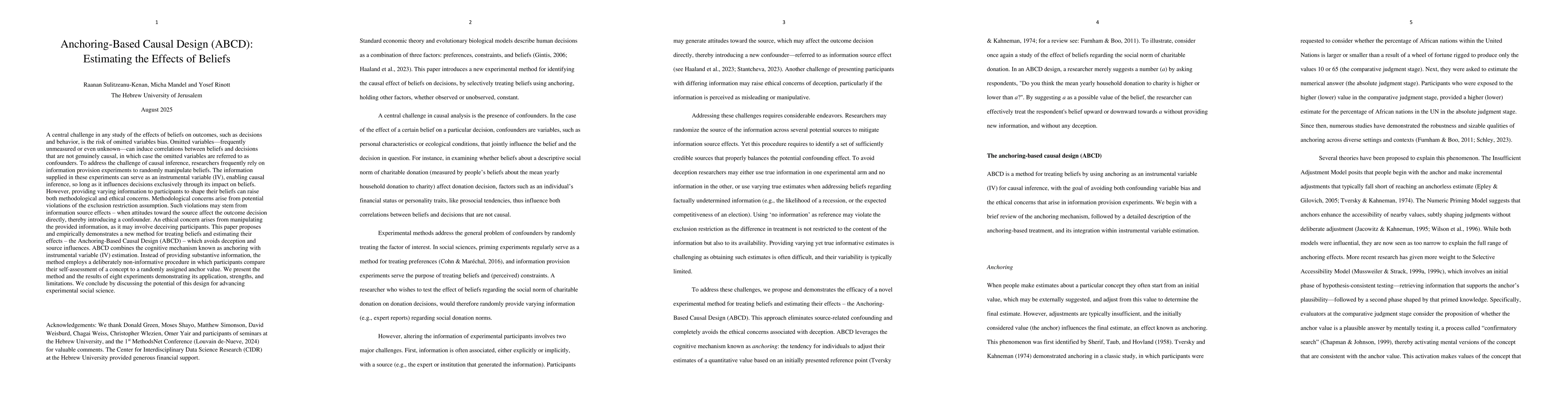 A central challenge in any study of the effects of beliefs on outcomes, such as decisions and behavior, is the risk of omitted variables bias. Omitted variables, frequently unmeasured or even unknown, can induce correlations between beliefs and decisions that are not genuinely causal, in which case the omitted variables are referred to as confounders. To address the challenge of causal inference, researchers frequently rely on information provision experiments to randomly manipulate beliefs. The information supplied in these experiments can serve as an instrumental variable (IV), enabling causal inference, so long as it influences decisions exclusively through its impact on beliefs. However, providing varying information to participants to shape their beliefs can raise both methodological and ethical concerns. Methodological concerns arise from potential violations of the exclusion restriction assumption. Such violations may stem from information source effects, when attitudes toward the source affect the outcome decision directly, thereby introducing a confounder. An ethical concern arises from manipulating the provided information, as it may involve deceiving participants. This paper proposes and empirically demonstrates a new method for treating beliefs and estimating their effects, the Anchoring-Based Causal Design (ABCD), which avoids deception and source influences. ABCD combines the cognitive mechanism known as anchoring with instrumental variable (IV) estimation. Instead of providing substantive information, the method employs a deliberately non-informative procedure in which participants compare their self-assessment of a concept to a randomly assigned anchor value. We present the method and the results of eight experiments demonstrating its application, strengths, and limitations. We conclude by discussing the potential of this design for advancing experimental social science.