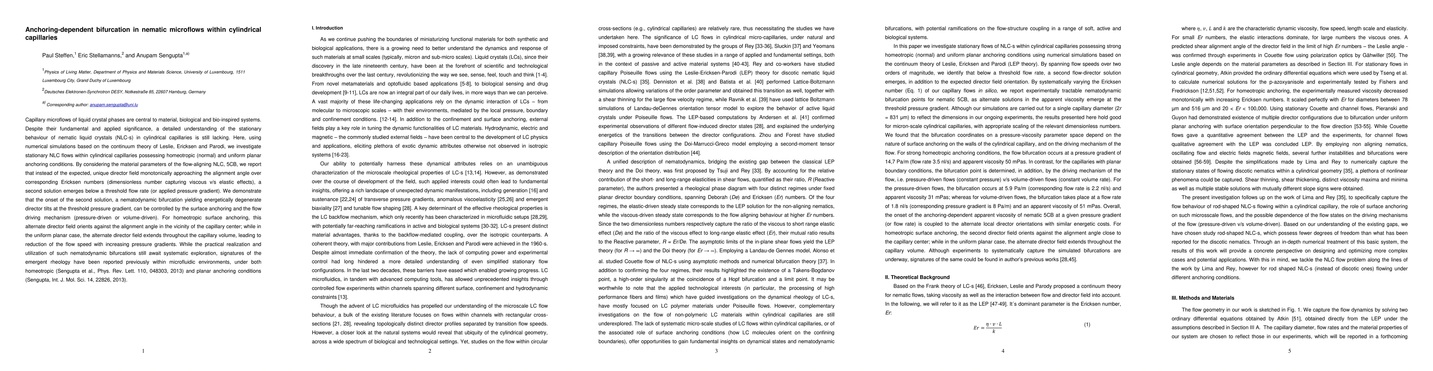 This study reveals an unexpected bifurcation in nematic liquid crystal flows within cylindrical capillaries, showing that below a certain flow rate, a second director field emerges alongside the expected one. The bifurcation's occurrence and nature are influenced by the surface anchoring conditions and the flow driving mechanism, with distinct director field orientations observed under homeotropic and planar anchoring.