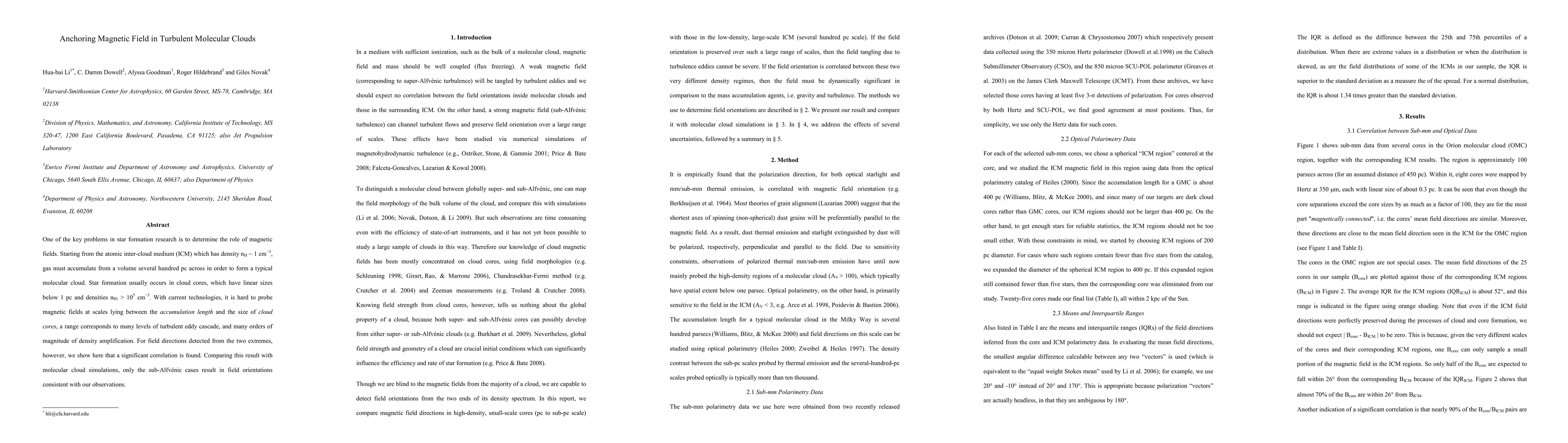 Researchers found a significant correlation between magnetic field directions in turbulent molecular clouds at scales between cloud cores and accumulation regions. This suggests that only sub-Alfvenic cases result in field orientations consistent with observations.