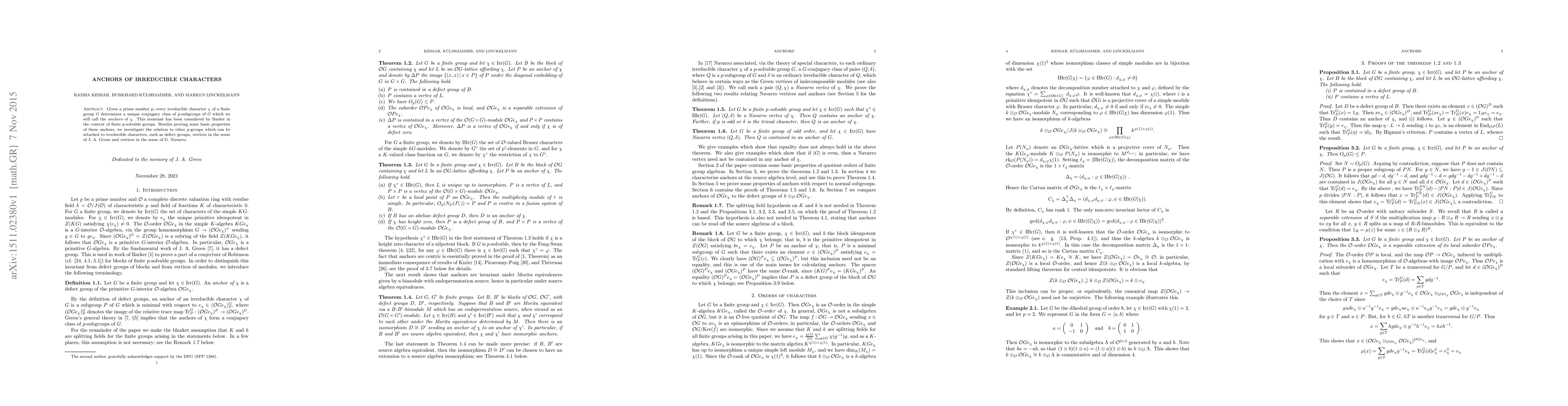 Given a prime number $p$, every irreducible character $\chi$ of a finite group $G$ determines a unique conjugacy class of $p$-subgroups of $G$ which we will call the anchors of $\chi$. This invariant has been considered by L. Barker in the context of finite $p$-solvable groups. Besides proving some basic properties of these anchors, we investigate the relation to other $p$-groups which can be attached to irreducible characters, such as defect groups, vertices in the sense of J. A. Green and vertices in the sense of G. Navarro.