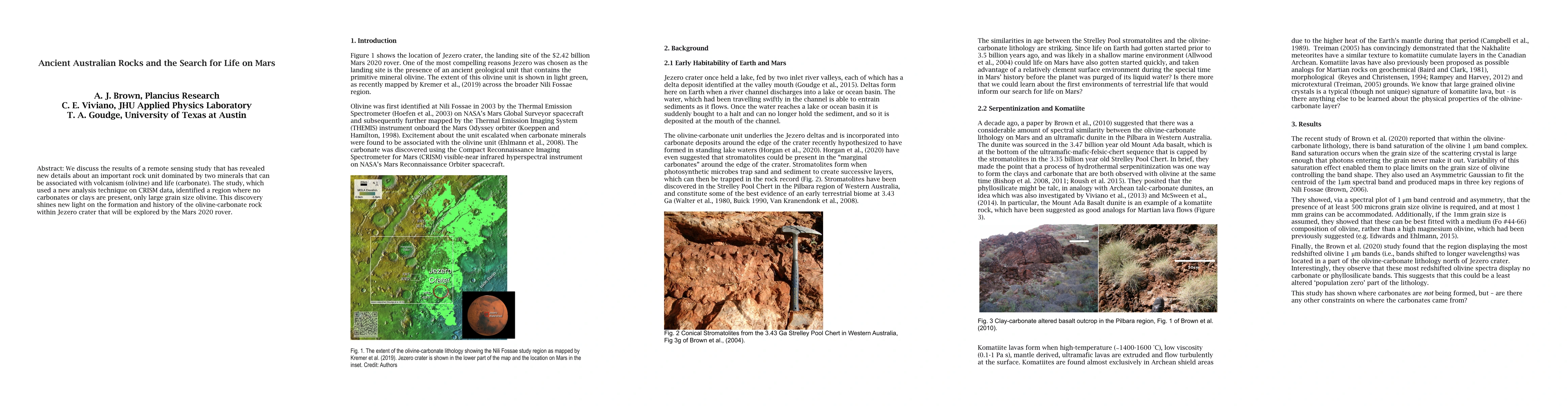 We discuss the results of a remote sensing study that has revealed new details about an important rock unit dominated by two minerals that can be associated with volcanism (olivine) and life (carbonate). The study, which used a new analysis technique on CRISM data, identified a region where no carbonates or clays are present, only large grain size olivine. This discovery shines new light on the formation and history of the olivine-carbonate rock within Jezero crater that will be explored by the Mars 2020 rover.