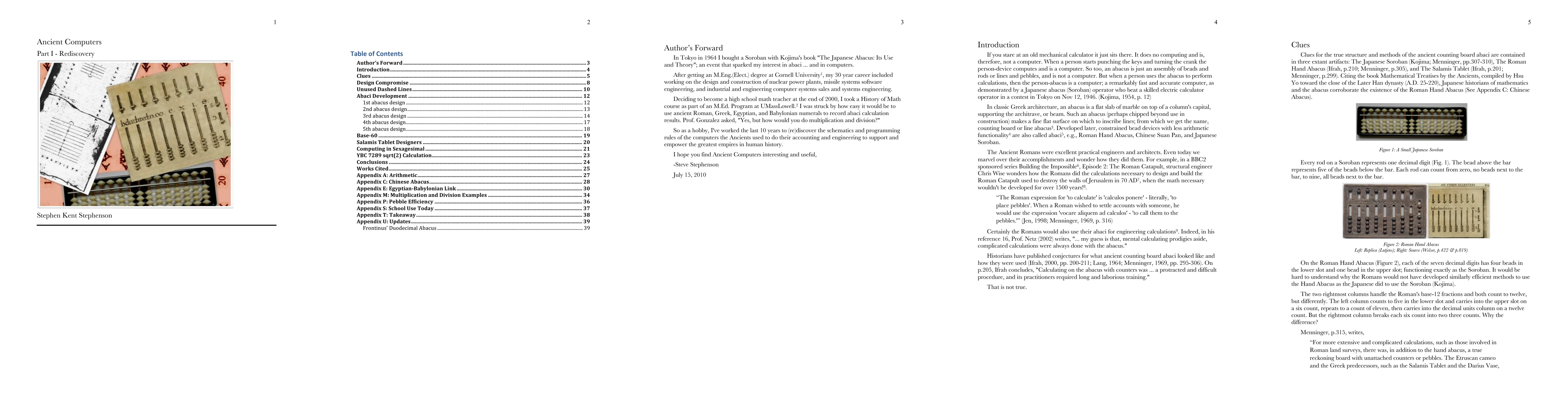 Pebbles (calculos in Latin) are the "bits" used in the Ancients' four function calculator / computer. The Ancient Computer's normal mode is to work with numbers in what we would call exponential notation. Decimal numbers can have up to 10 significant digits in the coefficient (a fraction < 1 with no leading zeros) and up to 4 significant digits in the exponent (a radix shift). Duodecimal and sexagesimal numbers can have up to 5 significant digits in the coefficient and up to 2 significant digits in the exponent. Coefficients and exponents can be either positive or negative. Built-in error checking is included since an addend can be entered and checked before accumulation. The Ancient Computer is time tested; it or its predecessors have been in use since before 2000 BC.