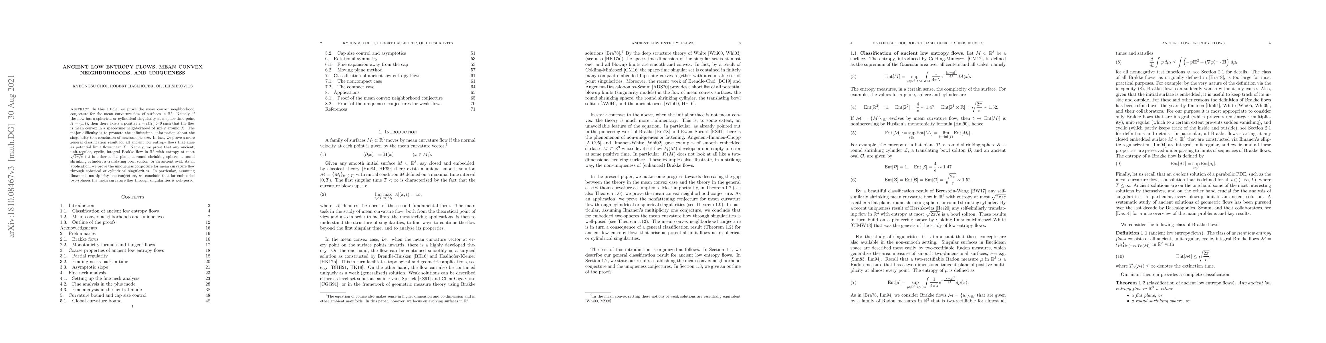 This paper proves the mean convex neighborhood conjecture for mean curvature flow, showing that near spherical or cylindrical singularities, the flow remains mean convex. It also classifies ancient low entropy flows, proving they are limited to a few specific types, and uses these results to establish the uniqueness of mean curvature flow through such singularities.