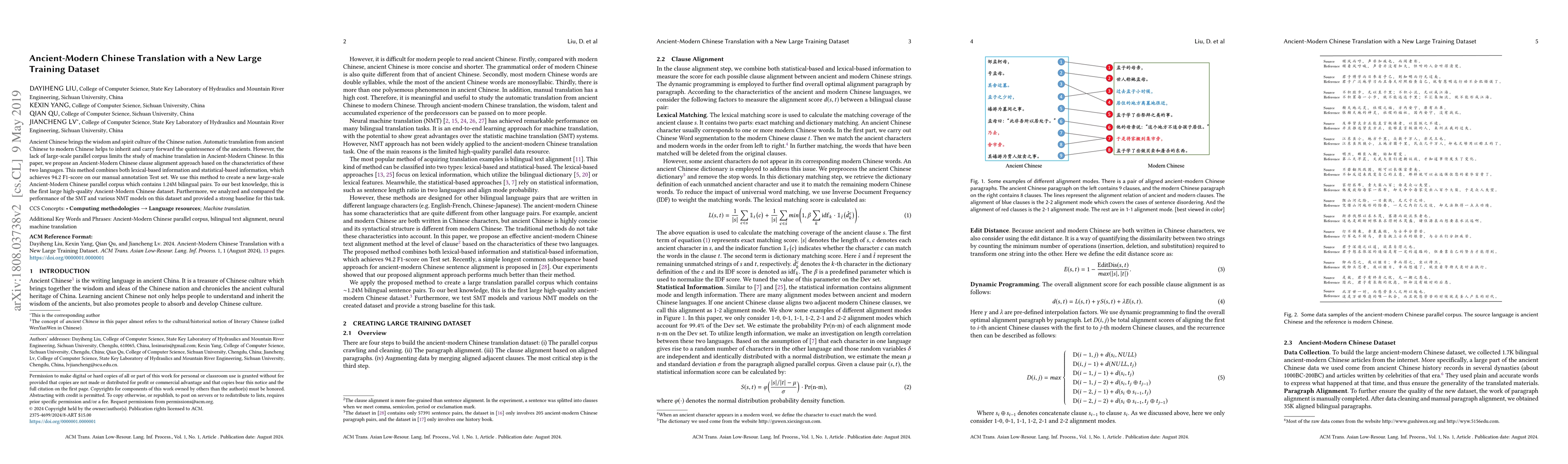 This paper proposes a clause alignment approach for translating Ancient Chinese to Modern Chinese, achieving a high F1-score. It creates a large-scale parallel corpus of 1.24M bilingual pairs, the first of its kind, and evaluates SMT and NMT models to establish a strong baseline for the task.