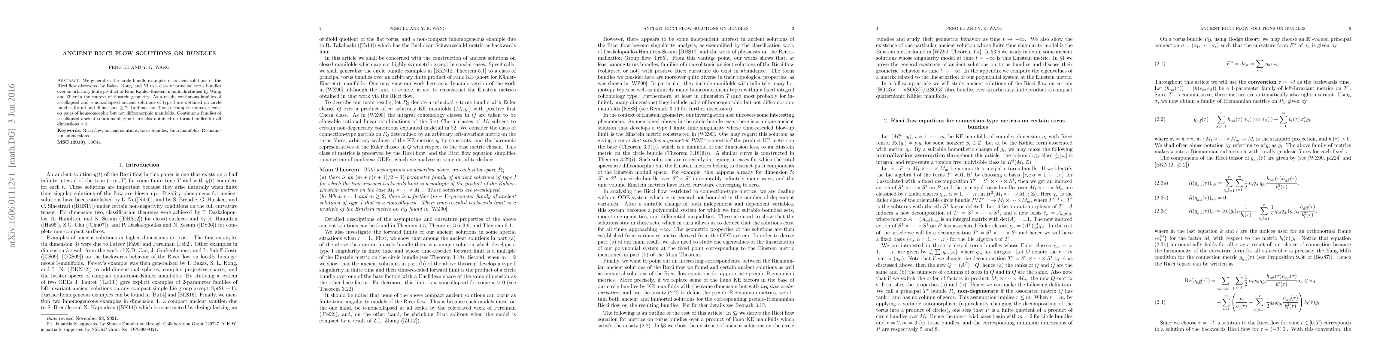 This paper generalizes ancient Ricci flow solutions from circle bundles to principal torus bundles over Fano Kähler-Einstein manifolds, yielding continuous families of collapsed and noncollapsed ancient solutions in various dimensions, including examples in dimension 7 on non-diffeomorphic manifolds. Torus bundle solutions are also found for dimensions greater than or equal to 8.