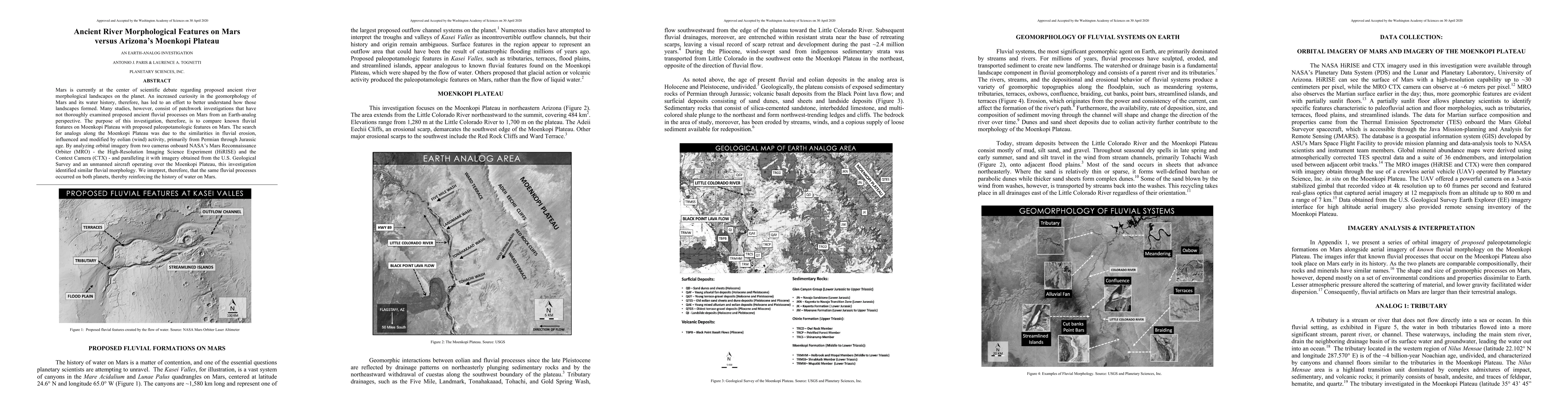 This research compares fluvial morphological features on Mars with those on Earth's Moenkopi Plateau, suggesting similar ancient river processes due to analogous fluvial erosion and eolian modification. Findings from Mars Reconnaissance Orbiter imagery and Moenkopi Plateau surveys support the hypothesis of shared geological history involving water on both planets.