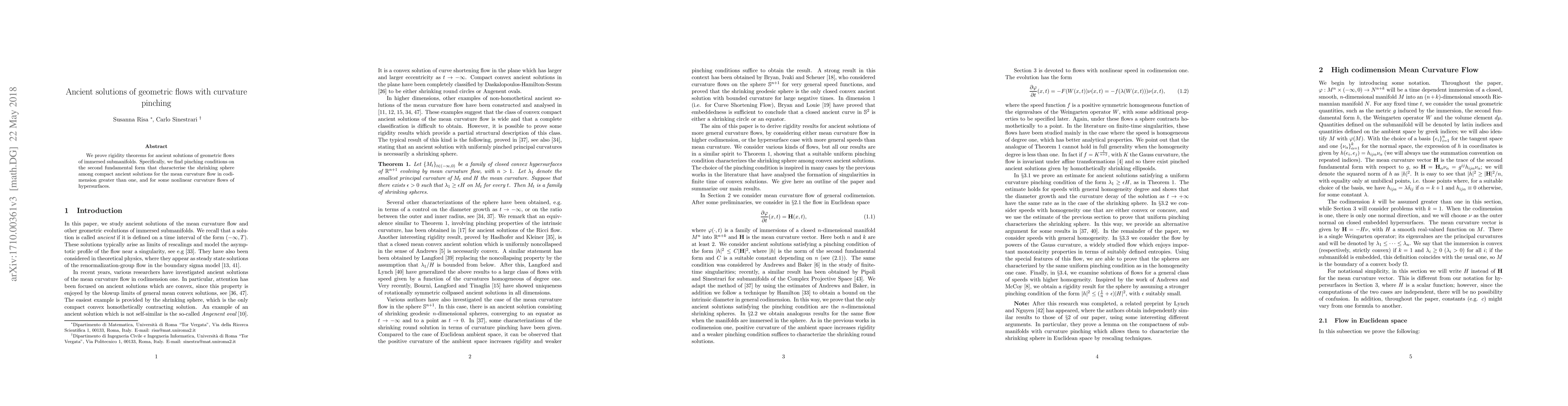 This paper proves rigidity theorems for ancient solutions of geometric flows, identifying pinching conditions on the second fundamental form that characterize the shrinking sphere among compact ancient solutions for mean curvature flow in higher codimension and certain nonlinear curvature flows of hypersurfaces.