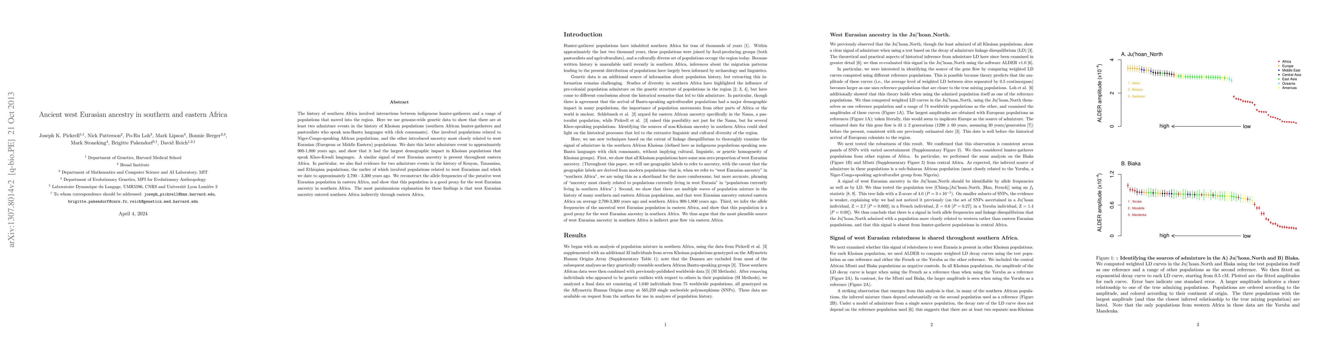 This paper uses genome-wide genetic data to reveal two admixture events in southern African Khoisan populations, one involving Niger-Congo-speaking populations and the other introducing west Eurasian ancestry approximately 900-1,800 years ago. Similar west Eurasian ancestry traces are found in eastern Africa, suggesting indirect migration routes.