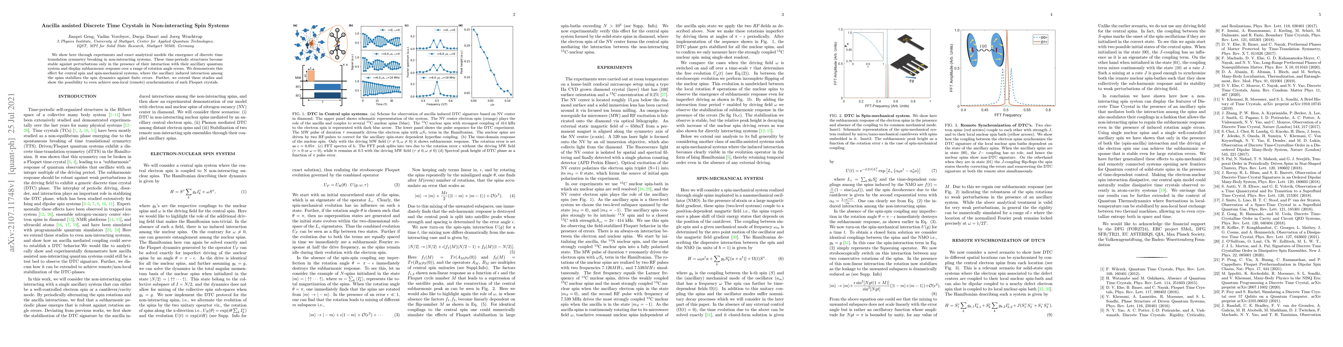 This paper demonstrates the emergence of discrete time crystals in non-interacting spin systems through experiments and analytical models, showing that ancillary-induced interactions stabilize these time-periodic structures against perturbations and enable subharmonic response. The study extends to non-local synchronization of such Floquet crystals.