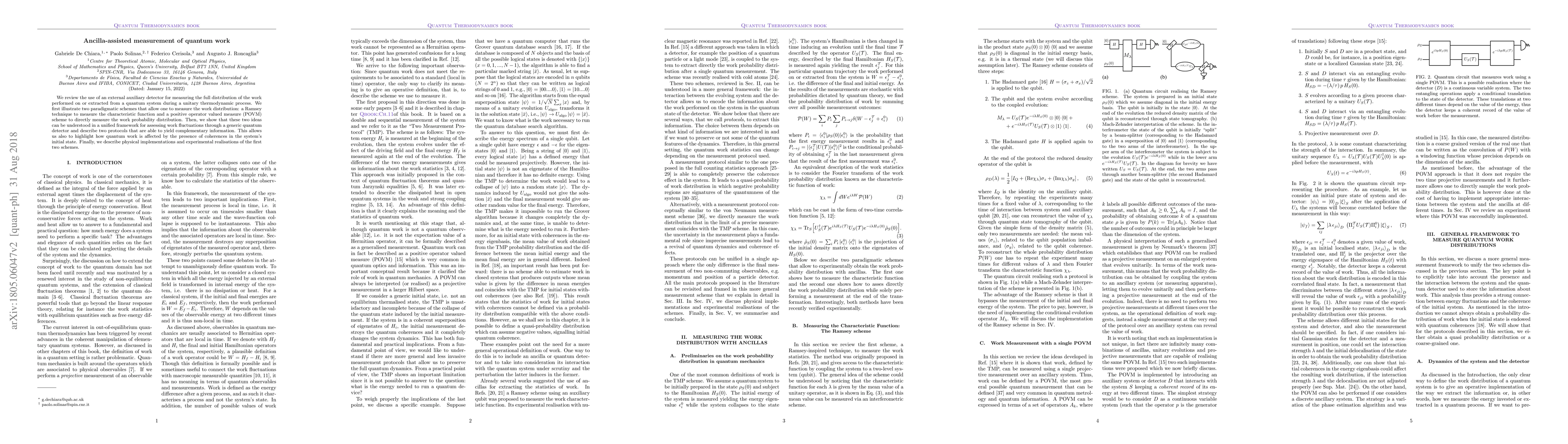 We review the use of an external auxiliary detector for measuring the full distribution of the work performed on or extracted from a quantum system during a unitary thermodynamic process. We first illustrate two paradigmatic schemes that allow one to measure the work distribution: a Ramsey technique to measure the characteristic function and a positive operator valued measure (POVM) scheme to directly measure the work probability distribution. Then, we show that these two ideas can be understood in a unified framework for assessing work fluctuations through a generic quantum detector and describe two protocols that are able to yield complementary information. This allows us also to highlight how quantum work is affected by the presence of coherences in the system's initial state. Finally, we describe physical implementations and experimental realisations of the first two schemes.