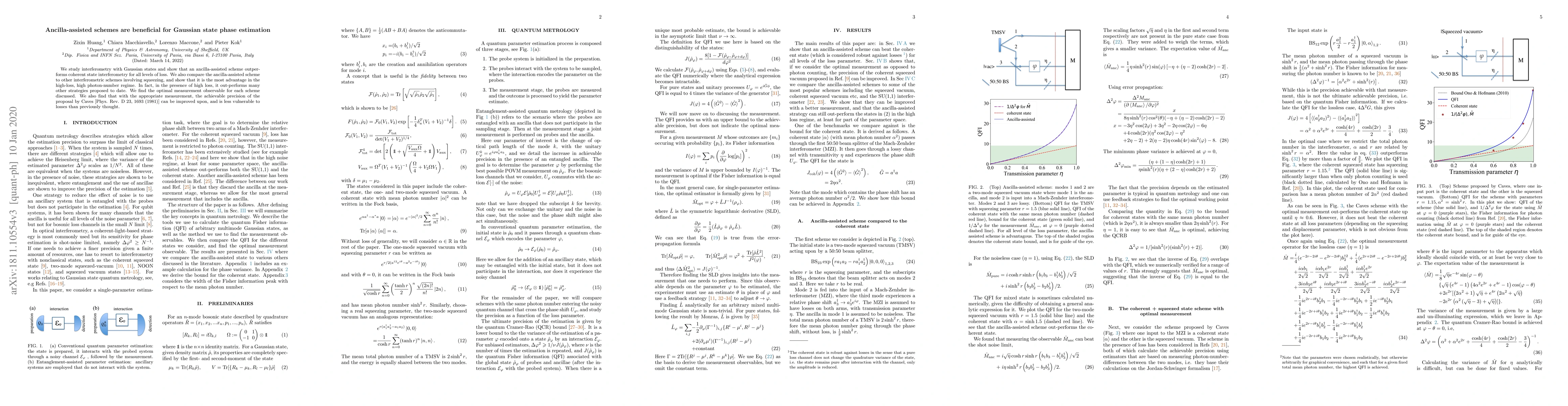 This paper demonstrates that ancilla-assisted schemes significantly improve Gaussian state phase estimation over coherent state interferometry, especially in high-loss scenarios. It also outperforms other interferometric methods involving squeezing and shows enhanced precision, even improving upon the proposal by Caves.
