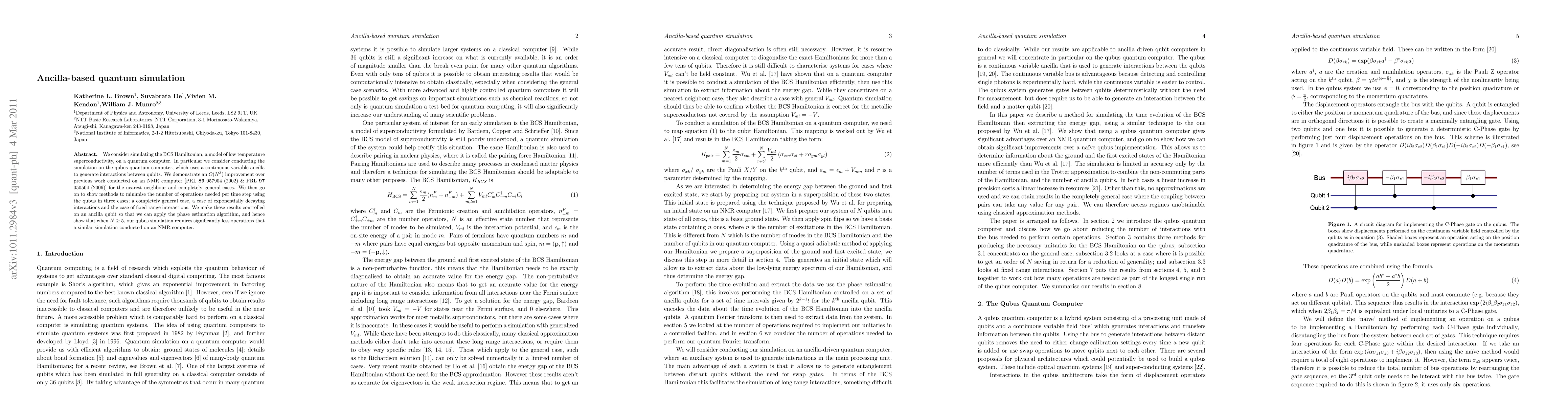 This research presents a method for simulating the BCS Hamiltonian on a qubus quantum computer using an ancilla-based approach, achieving an O(N^3) improvement over previous NMR-based simulations, particularly for general interaction cases. The study also optimizes the number of operations per time step and demonstrates significant efficiency gains for simulations with N ≥ 5.