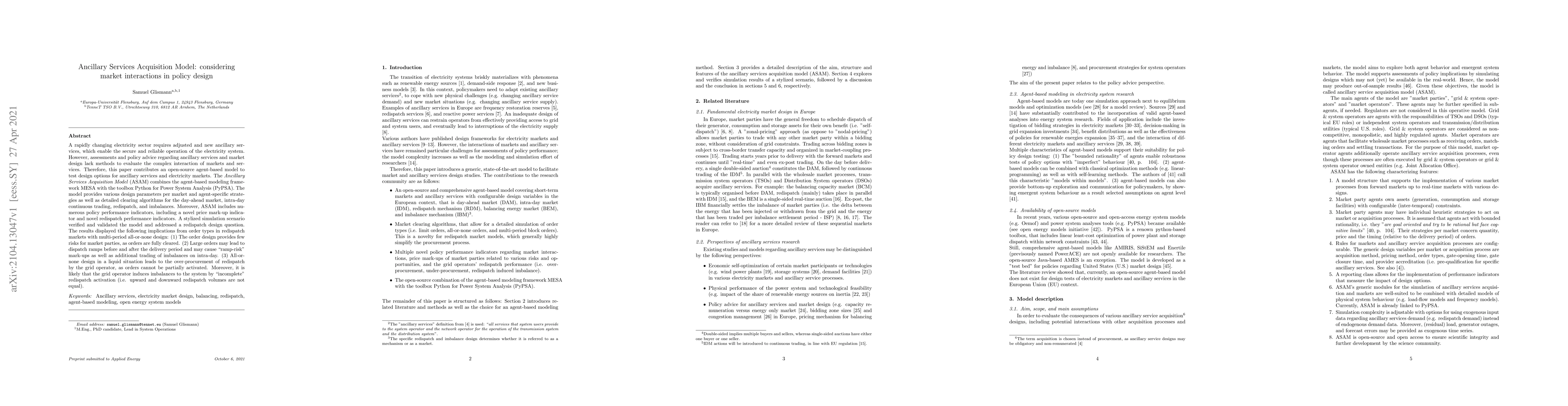 This paper introduces the Ancillary Services Acquisition Model (ASAM), an open-source agent-based model combining MESA and PyPSA to evaluate design options for ancillary services and electricity markets. The model's simulation revealed that multi-period all-or-none redispatch designs can lead to risks like ramp-risk mark-ups and over-procurement by grid operators.