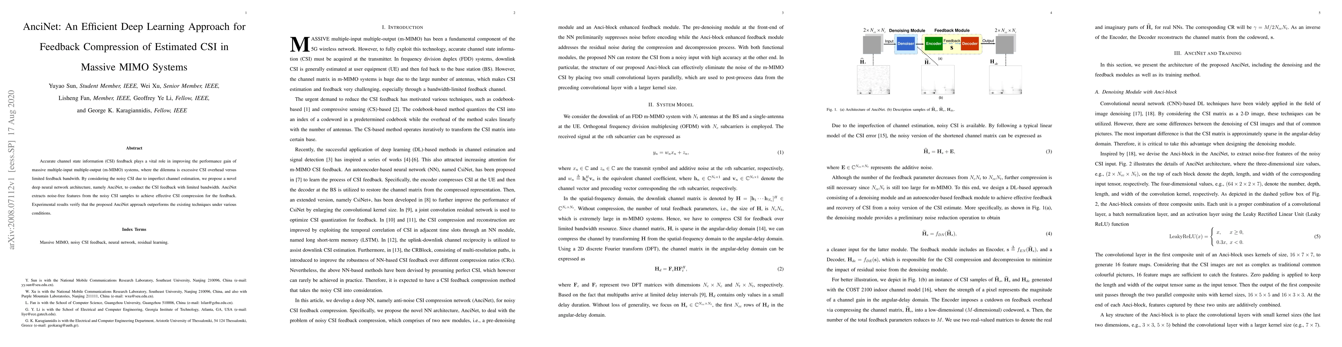 AnciNet is a novel deep learning architecture designed to compress noisy channel state information (CSI) feedback in massive MIMO systems, balancing the trade-off between CSI overhead and limited feedback bandwidth. Experimental results show that AnciNet outperforms existing techniques in effective CSI compression.