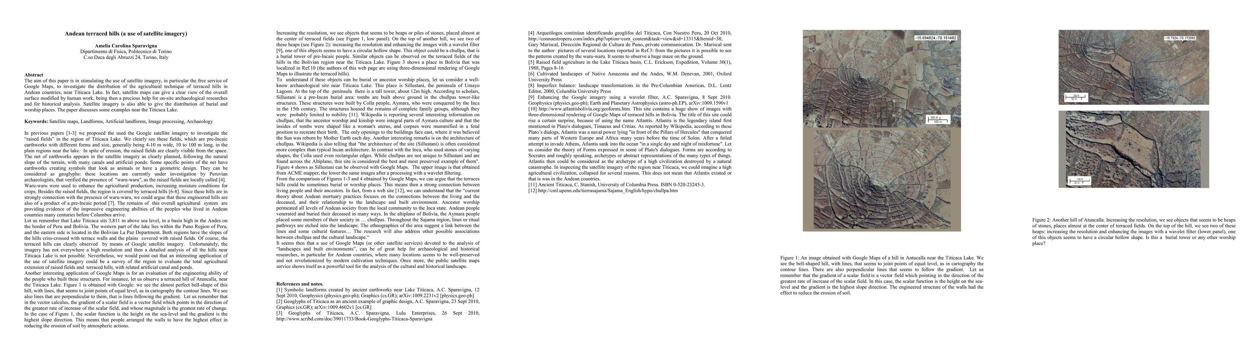 This paper explores the use of Google Maps satellite imagery to study the distribution of terraced hills in Andean countries near Titicaca Lake, highlighting its utility for archaeological research and historical analysis. It provides examples of how satellite imagery can reveal both agricultural terraces and burial sites.