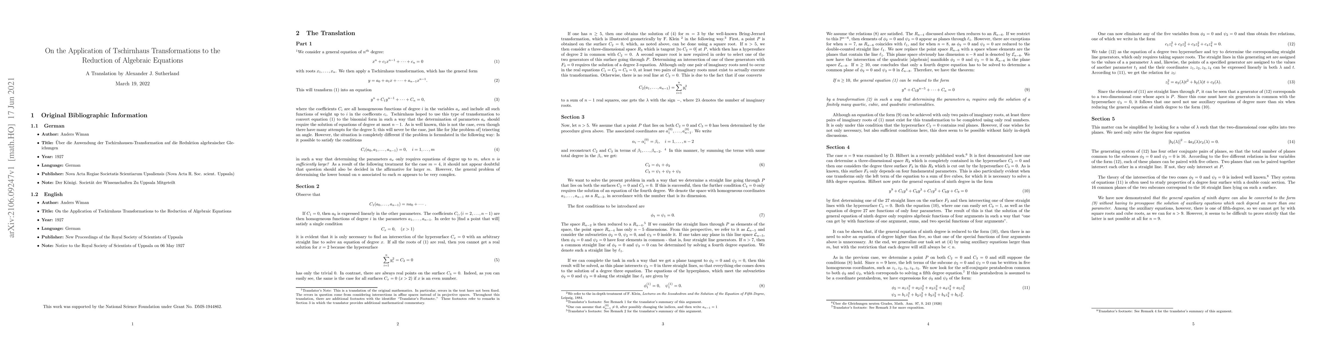 This is an English translation of Anders Wiman's classical paper "\"{U}ber die Anwendung der Tschirnhausen Transformation auf die Reduktion algebraischer Gleichungen" from 1927. The original work first appeared in the 1927 extraordinary edition of Nova Acta Regiae Societatis Scientiarum Upsaliensis. In this paper, Wiman gives an argument that the general polynomial of degree nine can be solved using one algebraic function of four variables and accessory irrationalities of degree at most five. However, his argument assumes certain intersections in affine space are generic without proof.