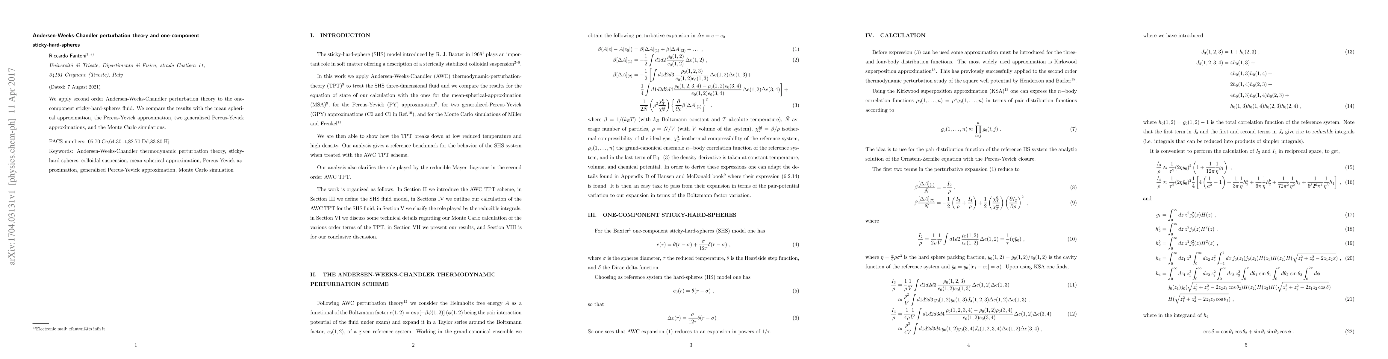 The Andersen-Weeks-Chandler perturbation theory was applied to the one-component sticky-hard-spheres fluid.