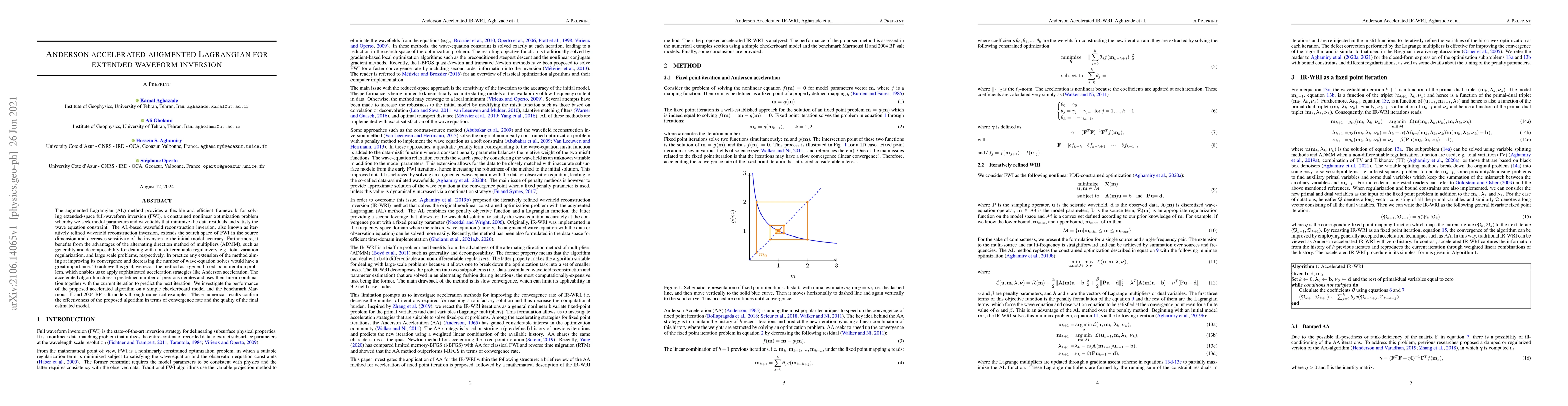 A new algorithm called Anderson accelerated augmented Lagrangian is proposed for solving full-waveform inversion problems, showing improved convergence rates and model quality compared to existing methods.
