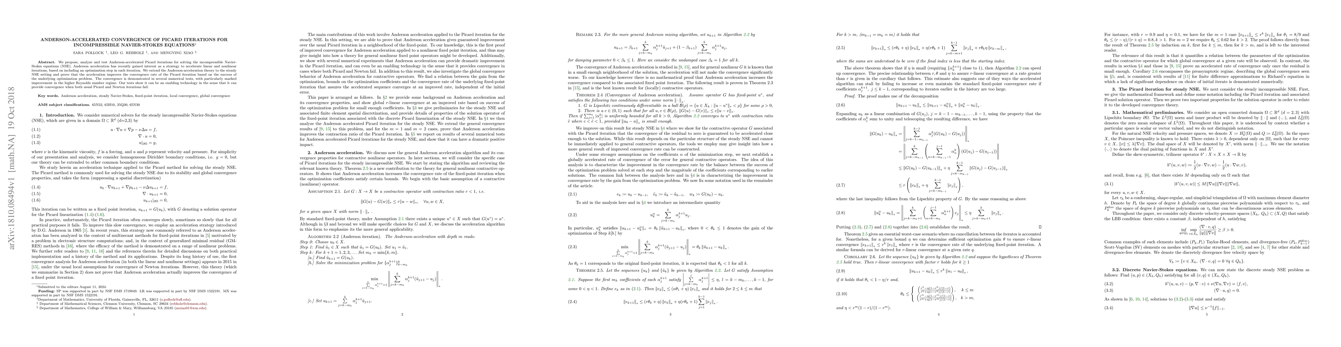 This paper proposes and analyzes Anderson-accelerated Picard iterations for solving incompressible Navier-Stokes equations, demonstrating improved convergence rates, especially at higher Reynolds numbers, and showing effectiveness where traditional methods fail. Numerical tests validate the theoretical improvements.