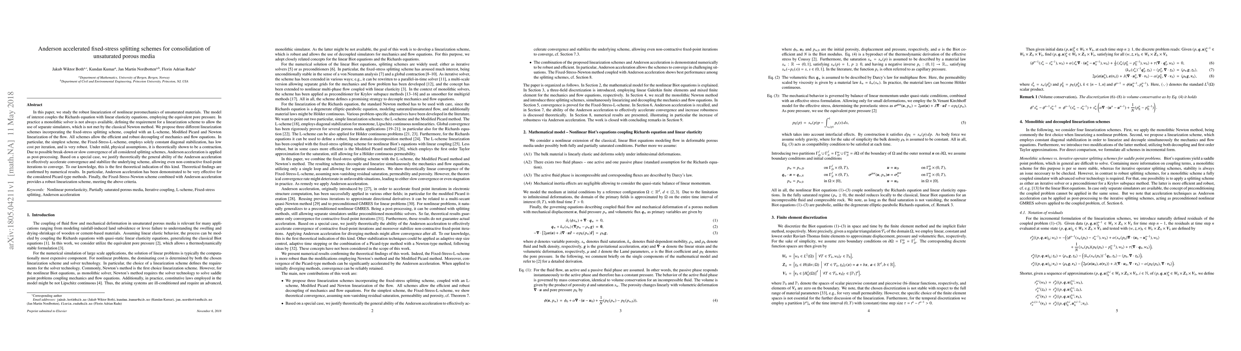In this paper, we study the robust linearization of nonlinear poromechanics of unsaturated materials. The model of interest couples the Richards equation with linear elasticity equations, employing the equivalent pore pressure. In practice a monolithic solver is not always available, defining the requirement for a linearization scheme to allow the use of separate simulators, which is not met by the classical Newton method. We propose three different linearization schemes incorporating the fixed-stress splitting scheme, coupled with an L-scheme, Modified Picard and Newton linearization of the flow. All schemes allow the efficient and robust decoupling of mechanics and flow equations. In particular, the simplest scheme, the Fixed-Stress-L-scheme, employs solely constant diagonal stabilization, has low cost per iteration, and is very robust. Under mild, physical assumptions, it is theoretically shown to be a contraction. Due to possible break-down or slow convergence of all considered splitting schemes, Anderson acceleration is applied as post-processing. Based on a special case, we justify theoretically the general ability of the Anderson acceleration to effectively accelerate convergence and stabilize the underlying scheme, allowing even non-contractive fixed-point iterations to converge. To our knowledge, this is the first theoretical indication of this kind. Theoretical findings are confirmed by numerical results. In particular, Anderson acceleration has been demonstrated to be very effective for the considered Picard-type methods. Finally, the Fixed-Stress-Newton scheme combined with Anderson acceleration provides a robust linearization scheme, meeting the above criteria.