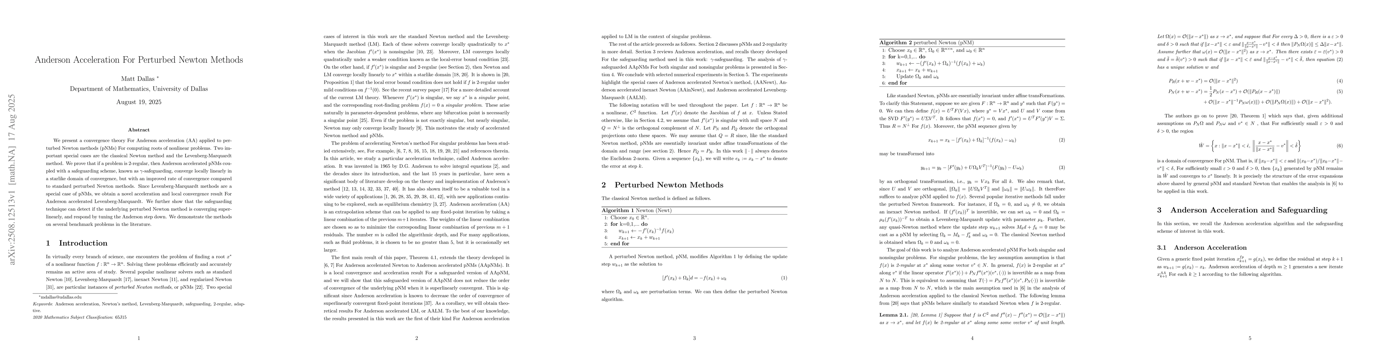 We present a convergence theory For Anderson acceleration (AA) applied to perturbed Newton methods (pNMs) For computing roots of nonlinear problems. Two important special cases are the classical Newton method and the Levenberg-Marquardt method. We prove that if a problem is 2-regular, then Anderson accelerated pNMs coupled with a safeguarding scheme, known as $\gamma$-safeguarding, converge locally linearly in a starlike domain of convergence, but with an improved rate of convergence compared to standard perturbed Newton methods. Since Levenberg-Marquardt methods are a special case of pNMs, we obtain a novel acceleration and local convergence result For Anderson accelerated Levenberg-Marquardt. We further show that the safeguarding technique can detect if the underlying perturbed Newton method is converging superlinearly, and respond by tuning the Anderson step down. We demonstrate the methods on several benchmark problems in the literature.