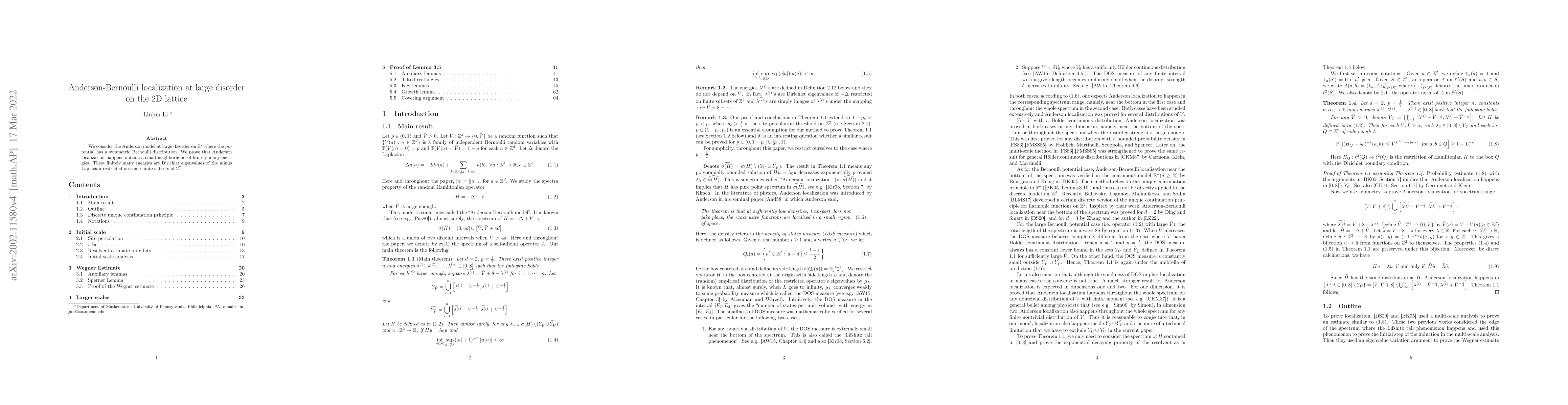 Summary: This paper proves Anderson localization in the 2D lattice with large symmetric Bernoulli disorder, demonstrating that localization occurs outside a small neighborhood around a finite number of specific energies, which are Dirichlet eigenvalues of the minus Laplacian on certain finite subsets.