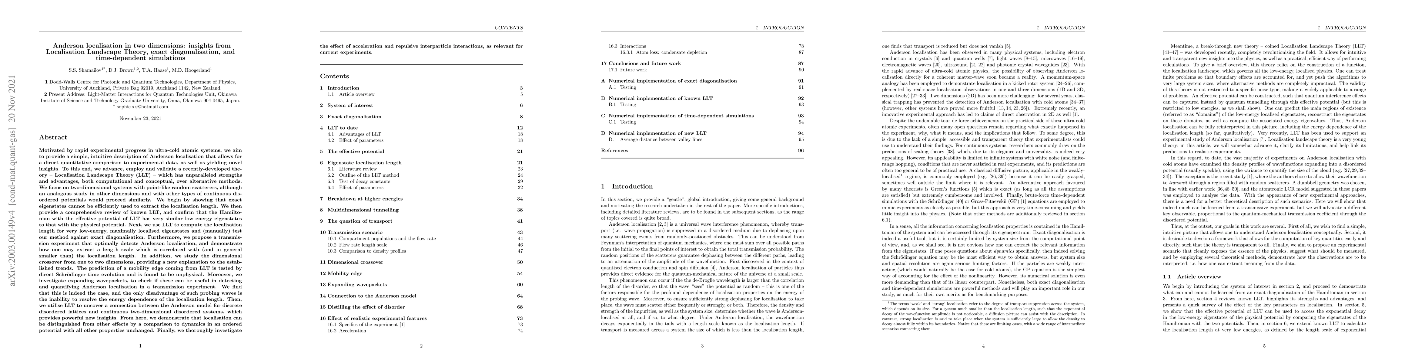 Motivated by experimental progress in cold atomic systems, we use and advance Localisation Landscape Theory (LLT), to examine two-dimensional systems with point-like random scatterers. We begin by showing that exact eigenstates cannot be efficiently used to extract the localisation length. We then provide a comprehensive review of known LLT, and confirm that the Hamiltonian with the effective potential of LLT has very similar low energy eigenstates to that with the physical potential. Next, we use LLT to compute the localisation length for very low-energy, maximally localised eigenstates and test our method against exact diagonalisation. Furthermore, we propose a transmission experiment that optimally detects Anderson localisation, and demonstrate how one may extract a length scale which is correlated with (and in general smaller than) the localisation length. In addition, we study the dimensional crossover from one to two dimensions, providing a new explanation to the established trends. The prediction of a mobility edge coming from LLT is tested by direct Schr\"odinger time evolution and is found to be unphysical. Moreover, we investigate expanding wavepackets, to find that these can be useful in detecting and quantifying Anderson localisation in a transmission experiment, with the only disadvantage being the inability to resolve the energy dependence of the localisation length. Then, we utilise LLT to uncover a connection between the Anderson model for discrete disordered lattices and continuous two-dimensional disordered systems, which provides powerful new insights. From here, we demonstrate that localisation can be distinguished from other effects by a comparison to dynamics in an ordered potential with all other properties unchanged. Finally, we thoroughly investigate the effect of acceleration and repulsive interparticle interactions, as relevant for current experiments.