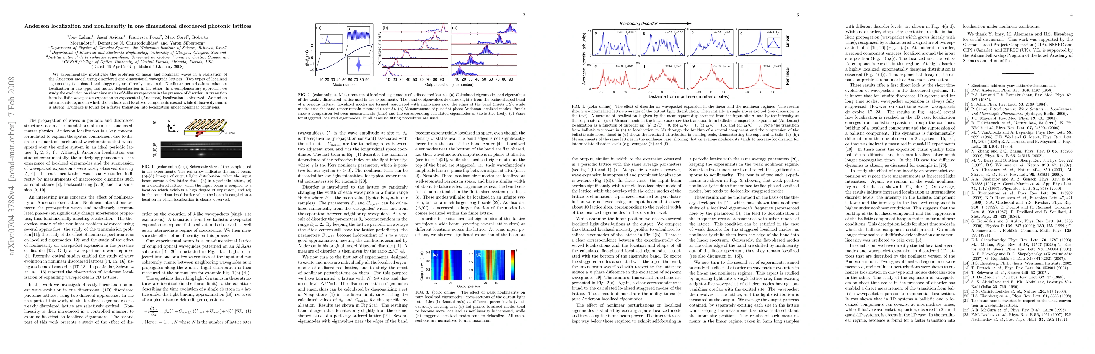This research investigates the interplay between Anderson localization and nonlinearity in one-dimensional disordered photonic lattices, demonstrating enhanced localization by nonlinear effects in one eigenmode type and delocalization in another. It also observes a transition from ballistic to exponential localization for wavepackets, with an intermediate regime showing coexistence of ballistic and localized components.