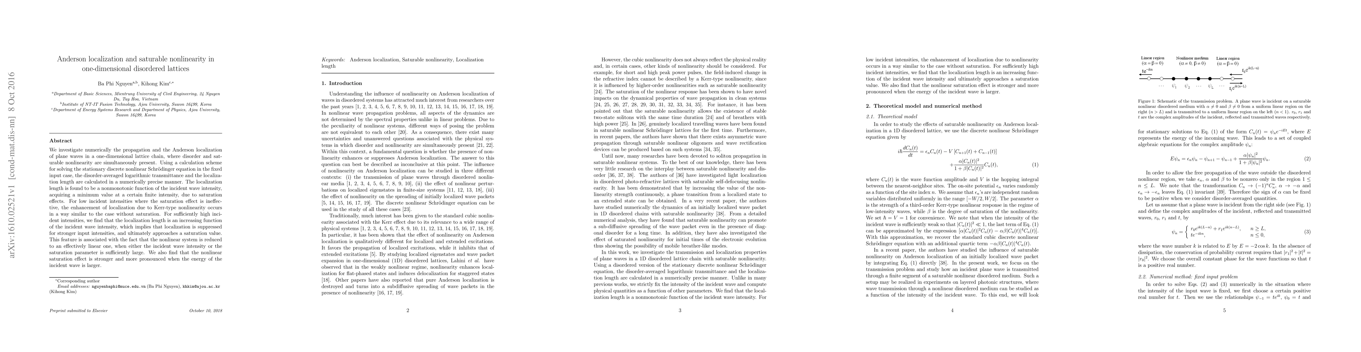 We investigate numerically the propagation and the Anderson localization of plane waves in a one-dimensional lattice chain, where disorder and saturable nonlinearity are simultaneously present. Using a calculation scheme for solving the stationary discrete nonlinear Schr\"{o}dinger equation in the fixed input case, the disorder-averaged logarithmic transmittance and the localization length are calculated in a numerically precise manner. The localization length is found to be a nonmonotonic function of the incident wave intensity, acquiring a minimum value at a certain finite intensity, due to saturation effects. For low incident intensities where the saturation effect is ineffective, the enhancement of localization due to Kerr-type nonlinearity occurs in a way similar to the case without saturation. For sufficiently high incident intensities, we find that the localization length is an increasing function of the incident wave intensity, which implies that localization is suppressed for stronger input intensities, and ultimately approaches a saturation value. This feature is associated with the fact that the nonlinear system is reduced to an effectively linear one, when either the incident wave intensity or the saturation parameter is sufficiently large. We also find that the nonlinear saturation effect is stronger and more pronounced when the energy of the incident wave is larger.
