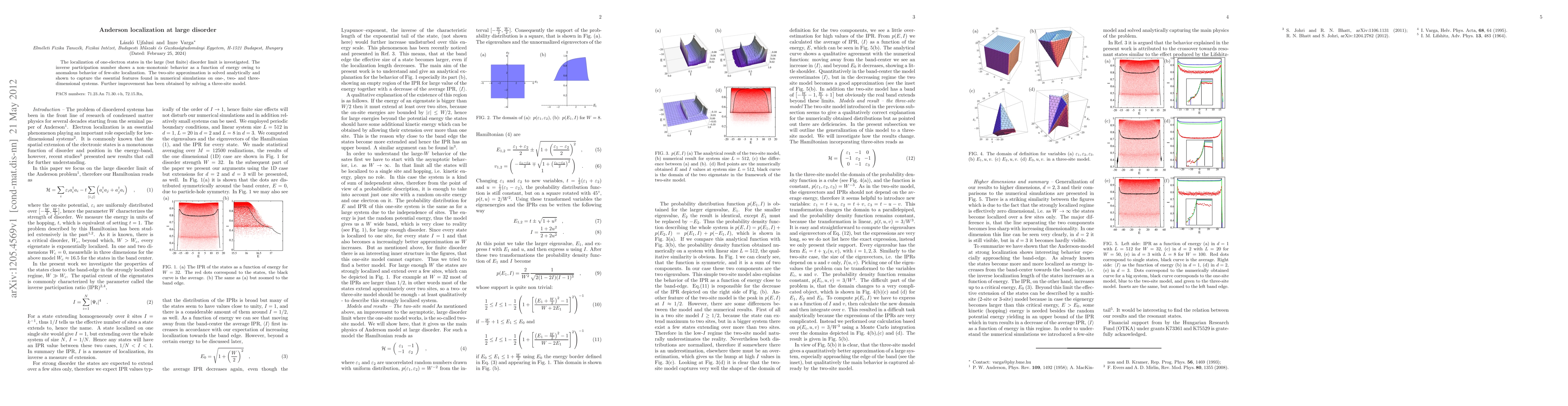 The localization of one-electron states in the large (but finite) disorder limit is investigated. The inverse participation number shows a non--monotonic behavior as a function of energy owing to anomalous behavior of few-site localization. The two-site approximation is solved analytically and shown to capture the essential features found in numerical simulations on one-, two- and three-dimensional systems. Further improvement has been obtained by solving a three-site model.