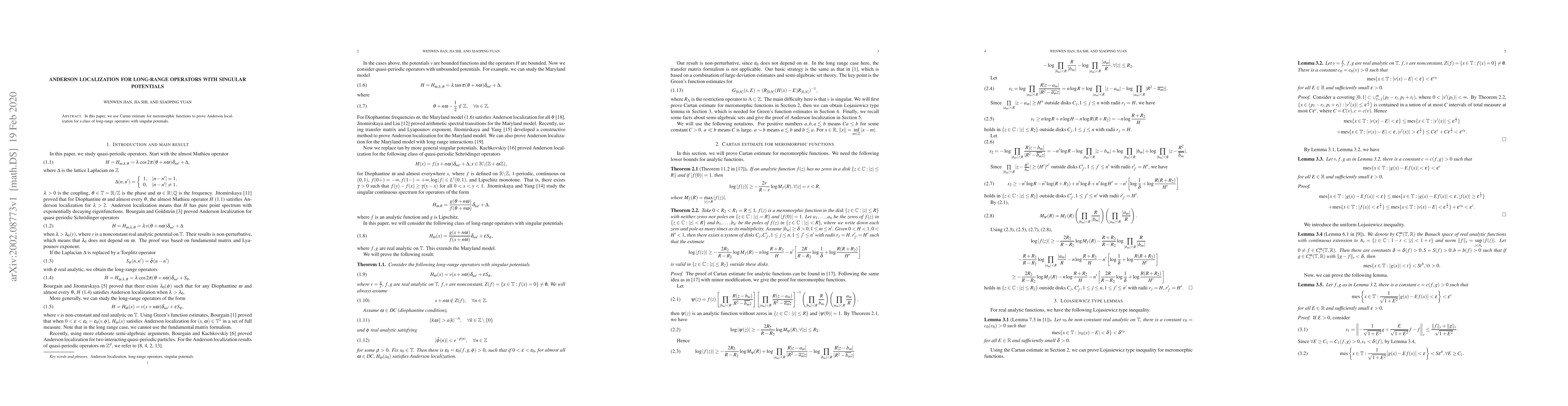 **Summary:** This research demonstrates Anderson localization for long-range operators with singular potentials using a Cartan estimate for meromorphic functions, establishing a novel theoretical framework for understanding such localization phenomena.
