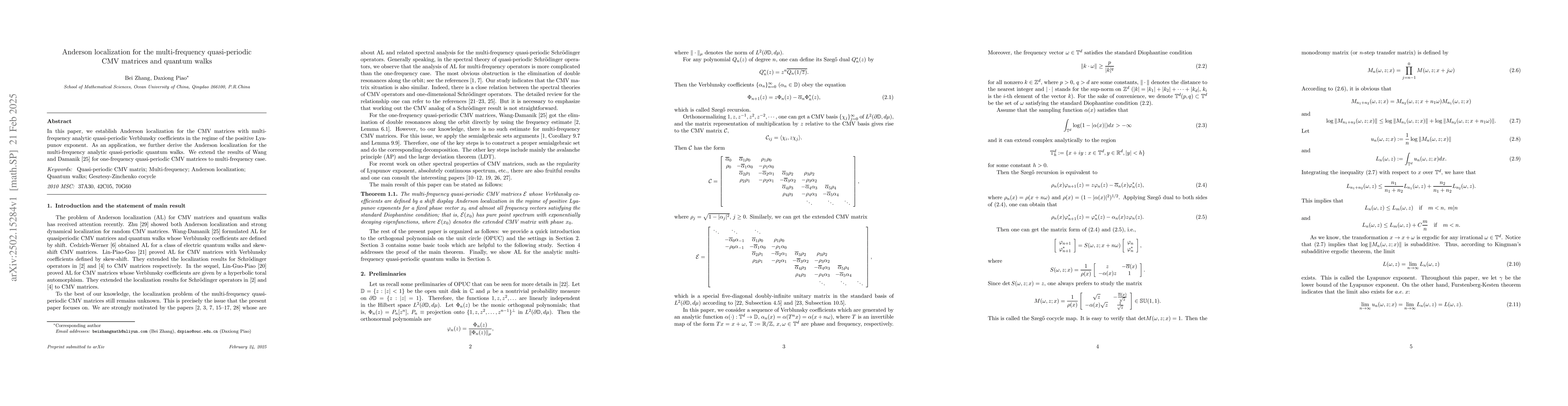 The paper extends the theoretical framework for Anderson localization to multi-frequency quasi-periodic CMV matrices, providing a rigorous proof for quantum walks in such settings.