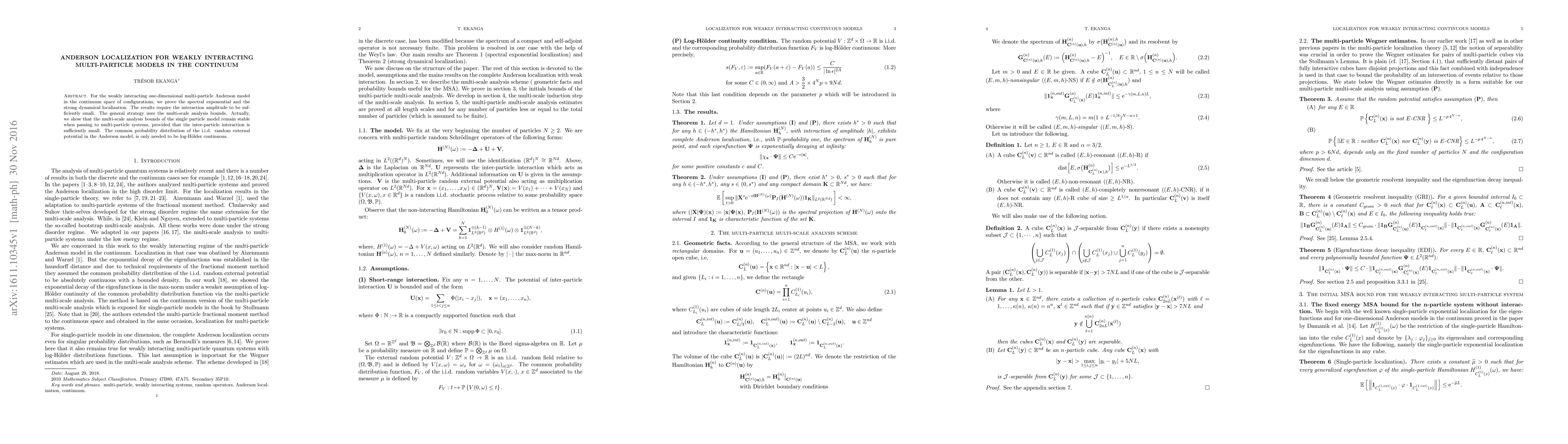 For the weakly interacting one-dimensional multi-particle Anderson model in the continuum space of configurations, we prove the spectral exponential and the strong dynamical localization. The results require the interaction amplitude to be sufficiently small. The general strategy uses the multi-scale analysis bounds. Actually, we show that the multi-scale analysis bounds of the single particle model remain stable when passing to multi-particle systems, provided that the inter-particle interaction is sufficiently small. The common probability distribution of the i.i.d. random external potential in the Anderson model, is only needed to be log-H\"older continuous.