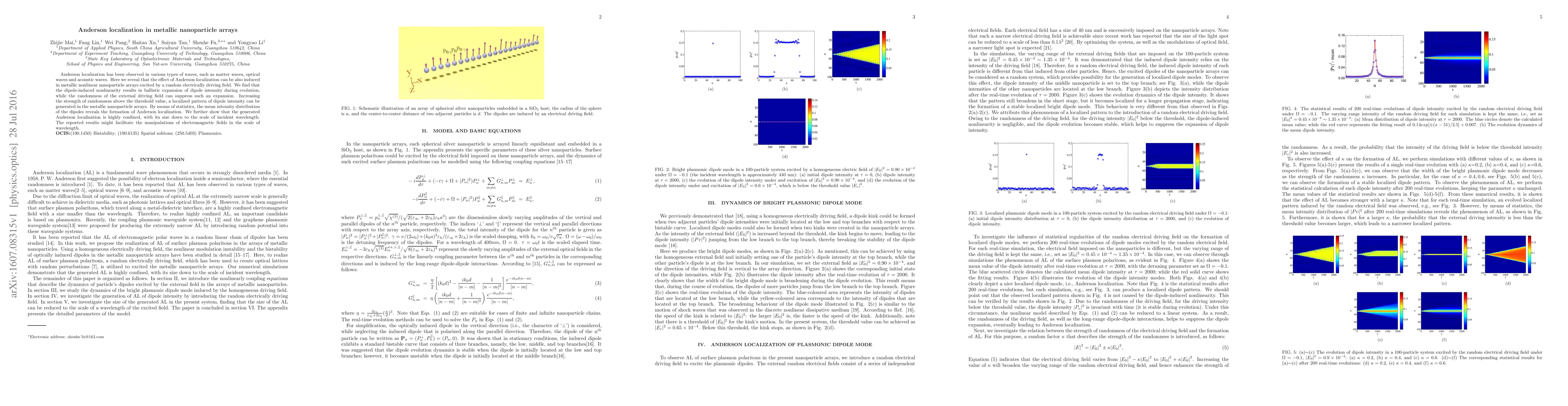This research demonstrates Anderson localization in metallic nanoparticle arrays driven by random electric fields, showing that dipole-induced nonlinearity can suppress ballistic dipole intensity expansion. The results reveal a highly confined localized pattern of dipole intensity, suggesting potential for manipulating electromagnetic fields at the wavelength scale.