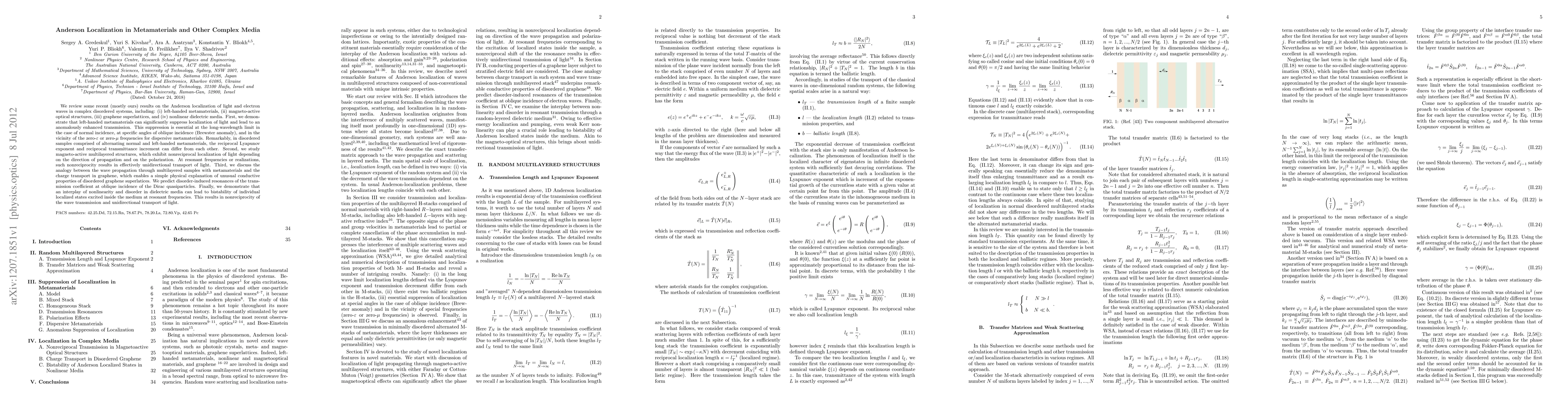 We review some recent (mostly ours) results on the Anderson localization of light and electron waves in complex disordered systems, including: (i) left-handed metamaterials, (ii) magneto-active optical structures, (iii) graphene superlattices, and (iv) nonlinear dielectric media. First, we demonstrate that left-handed metamaterials can significantly suppress localization of light and lead to an anomalously enhanced transmission. This suppression is essential at the long-wavelength limit in the case of normal incidence, at specific angles of oblique incidence (Brewster anomaly), and in the vicinity of the zero-epsilon or zero-mu frequencies for dispersive metamaterials. Remarkably, in disordered samples comprised of alternating normal and left-handed metamaterials, the reciprocal Lyapunov exponent and reciprocal transmittance increment can differ from each other. Second, we study magneto-active multilayered structures, which exhibit nonreciprocal localization of light depending on the direction of propagation and on the polarization. At resonant frequencies or realizations, such nonreciprocity results in effectively unidirectional transport of light. Third, we discuss the analogy between the wave propagation through multilayered samples with metamaterials and the charge transport in graphene, which enables a simple physical explanation of unusual conductive properties of disordered graphene superlatices. We predict disorder-induced resonances of the transmission coefficient at oblique incidence of the Dirac quasiparticles. Finally, we demonstrate that an interplay of nonlinearity and disorder in dielectric media can lead to bistability of individual localized states excited inside the medium at resonant frequencies. This results in nonreciprocity of the wave transmission and unidirectional transport of light.