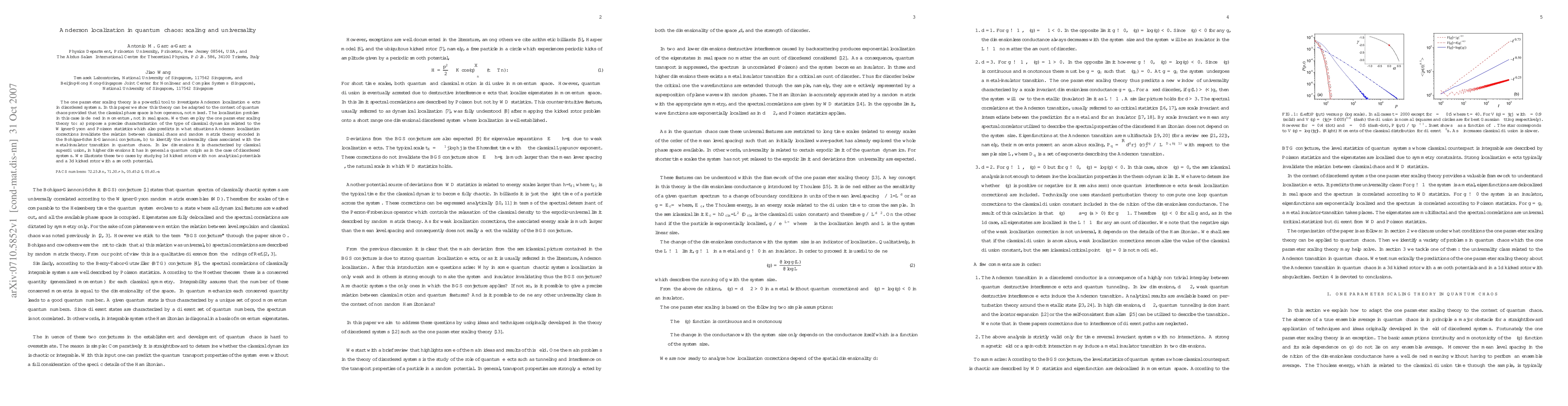 This paper explores Anderson localization in quantum chaos using one parameter scaling theory, showing its applicability when classical phase space is homogeneous. It characterizes the type of classical dynamics related to Wigner-Dyson and Poisson statistics and identifies the universality class for the metal-insulator transition, illustrating these findings through studies of 1D and 3D kicked rotors.