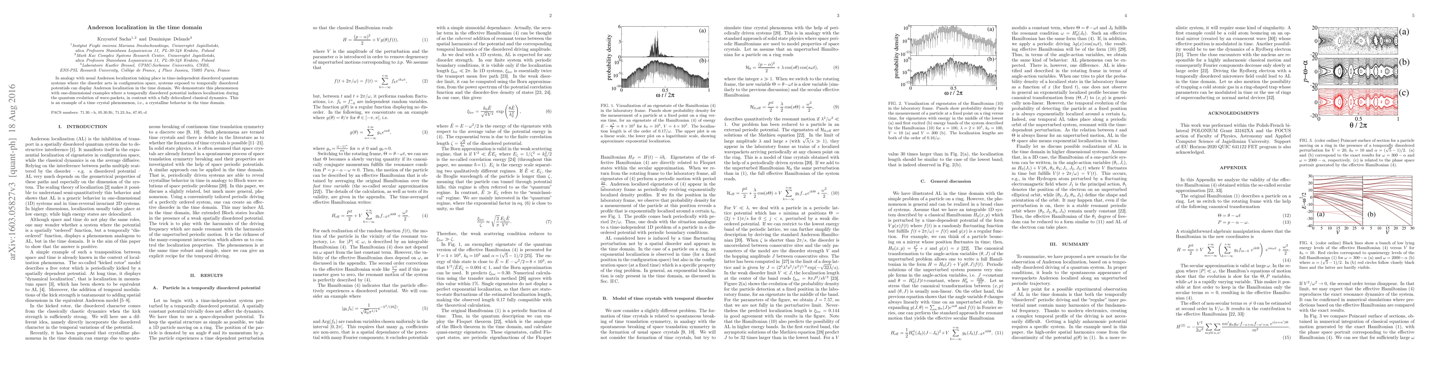 Anderson localization in time-domain is demonstrated in one-dimensional systems with temporally disordered potentials, showing quantum wave-packet localization unlike classical dynamics, exemplifying a time crystal behavior.