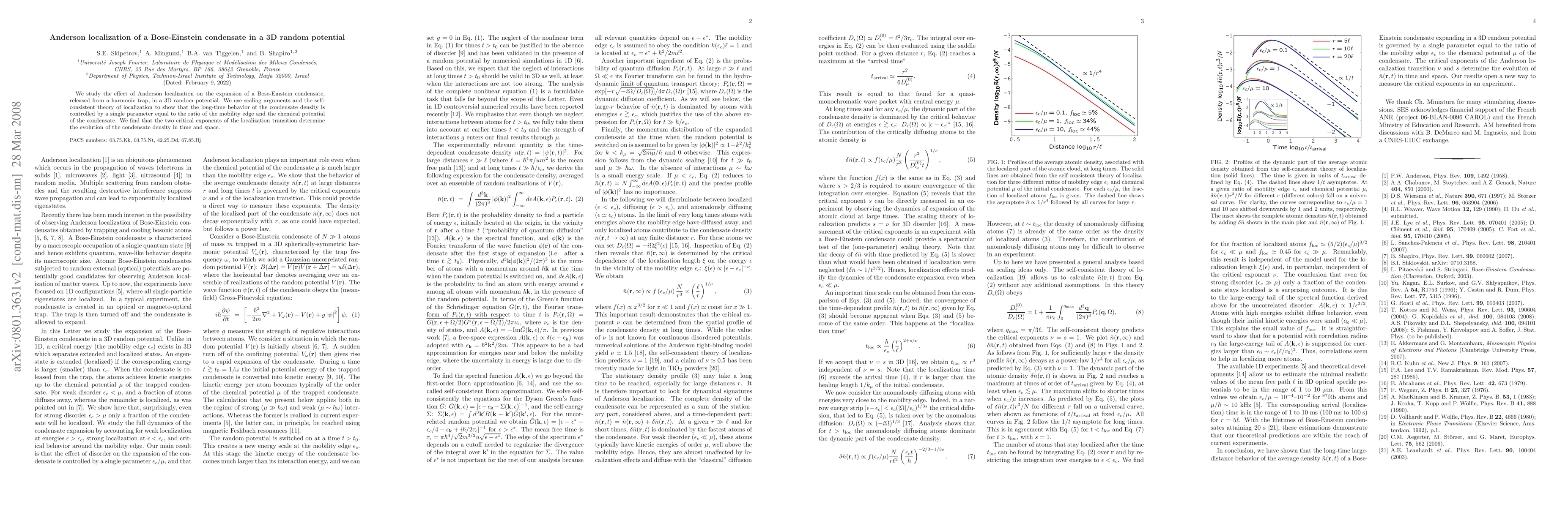 Summary: This study investigates Anderson localization's impact on a Bose-Einstein condensate in a 3D random potential, revealing that the long-time condensate density expansion is governed by the ratio of the mobility edge to the chemical potential, with critical exponents dictating its temporal and spatial evolution.