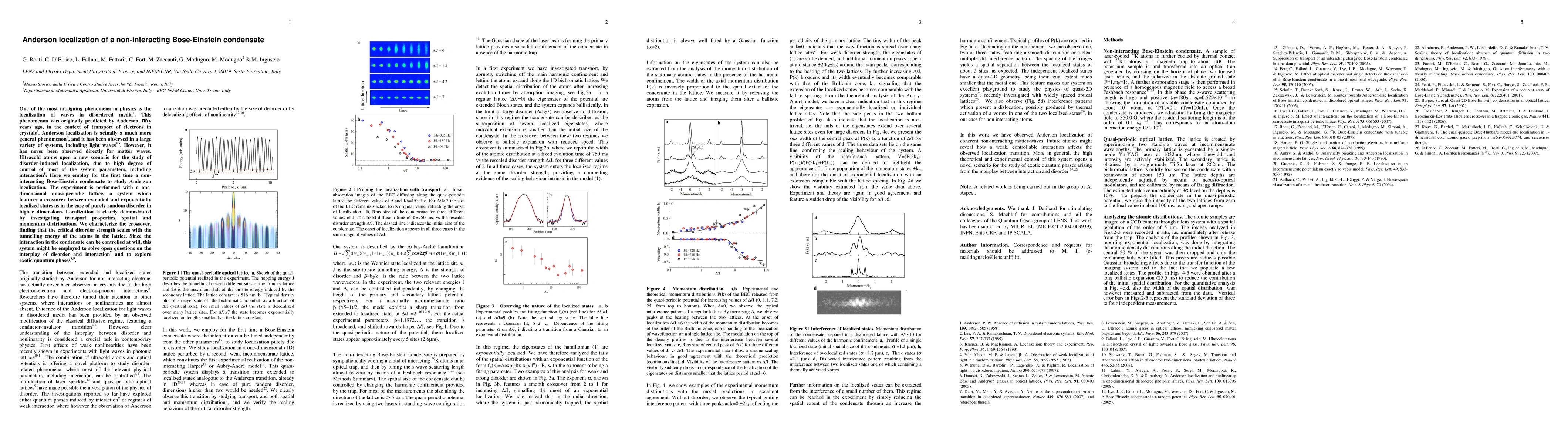 One of the most intriguing phenomena in physics is the localization of waves in disordered media. This phenomenon was originally predicted by Anderson, fifty years ago, in the context of transport of electrons in crystals. Anderson localization is actually a much more general phenomenon, and it has been observed in a large variety of systems, including light waves. However, it has never been observed directly for matter waves. Ultracold atoms open a new scenario for the study of disorder-induced localization, due to high degree of control of most of the system parameters, including interaction. Here we employ for the first time a noninteracting Bose-Einstein condensate to study Anderson localization. The experiment is performed with a onedimensional quasi-periodic lattice, a system which features a crossover between extended and exponentially localized states as in the case of purely random disorder in higher dimensions. Localization is clearly demonstrated by investigating transport properties, spatial and momentum distributions. We characterize the crossover, finding that the critical disorder strength scales with the tunnelling energy of the atoms in the lattice. Since the interaction in the condensate can be controlled at will, this system might be employed to solve open questions on the interplay of disorder and interaction and to explore exotic quantum phases.
